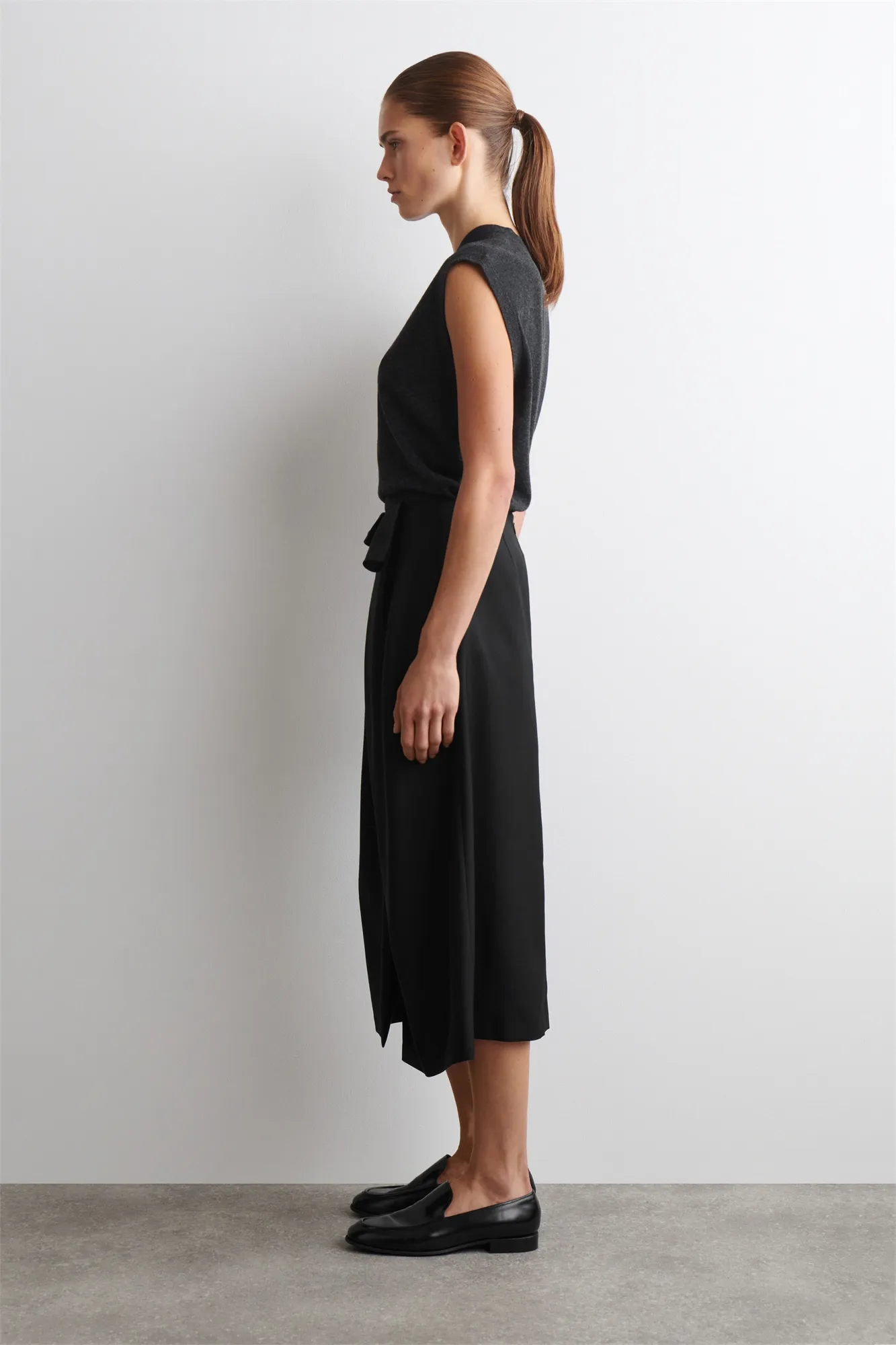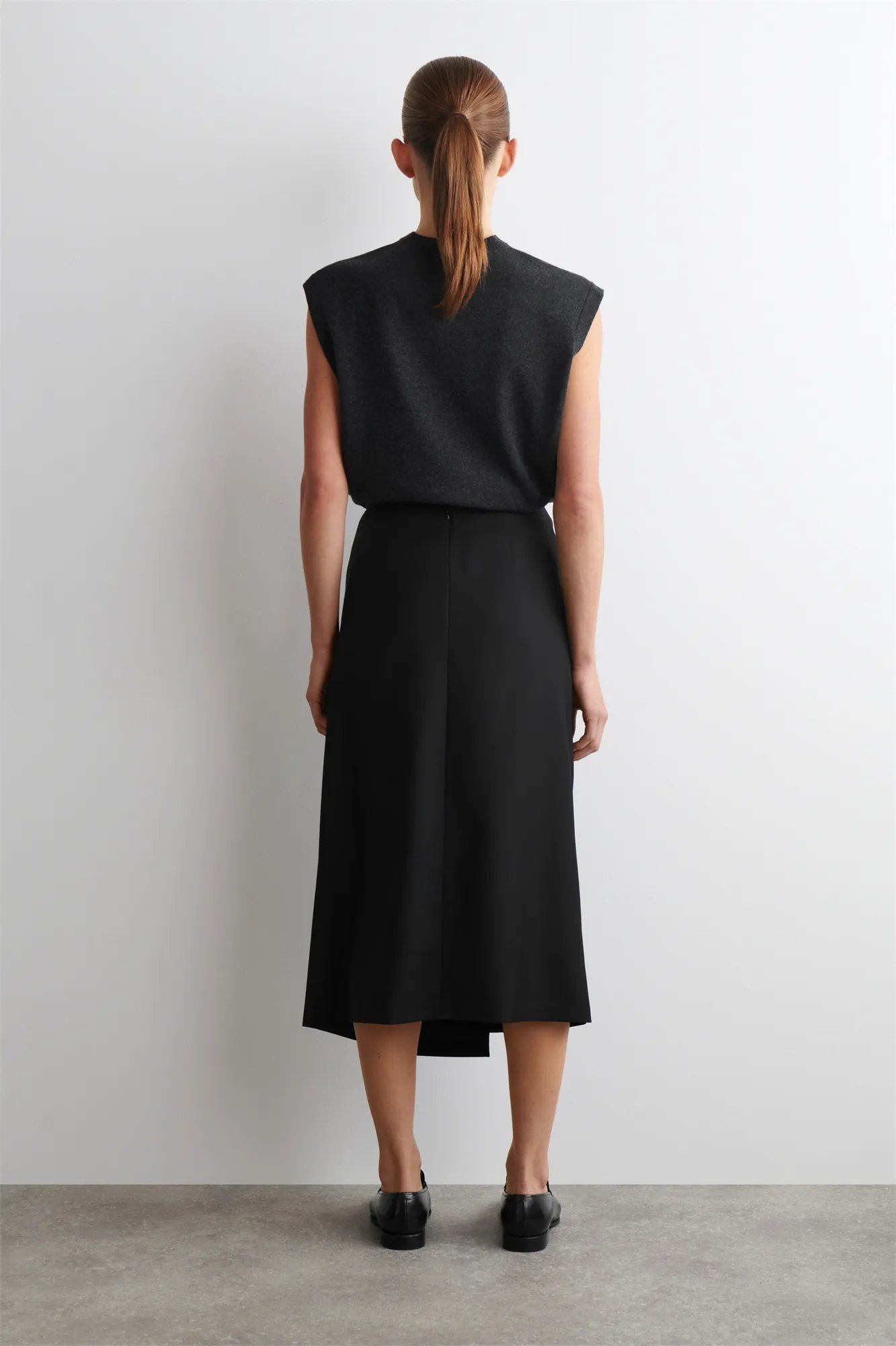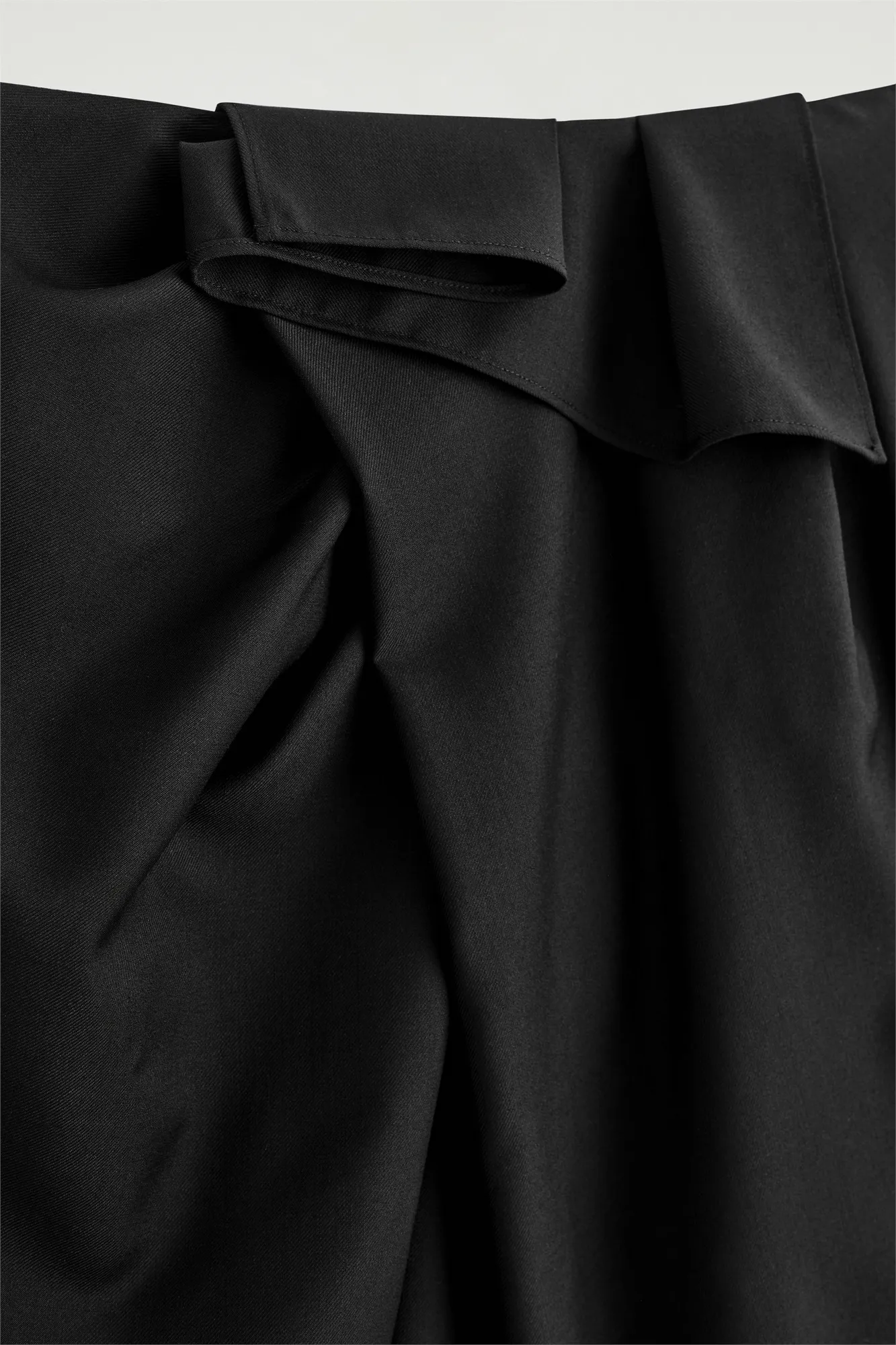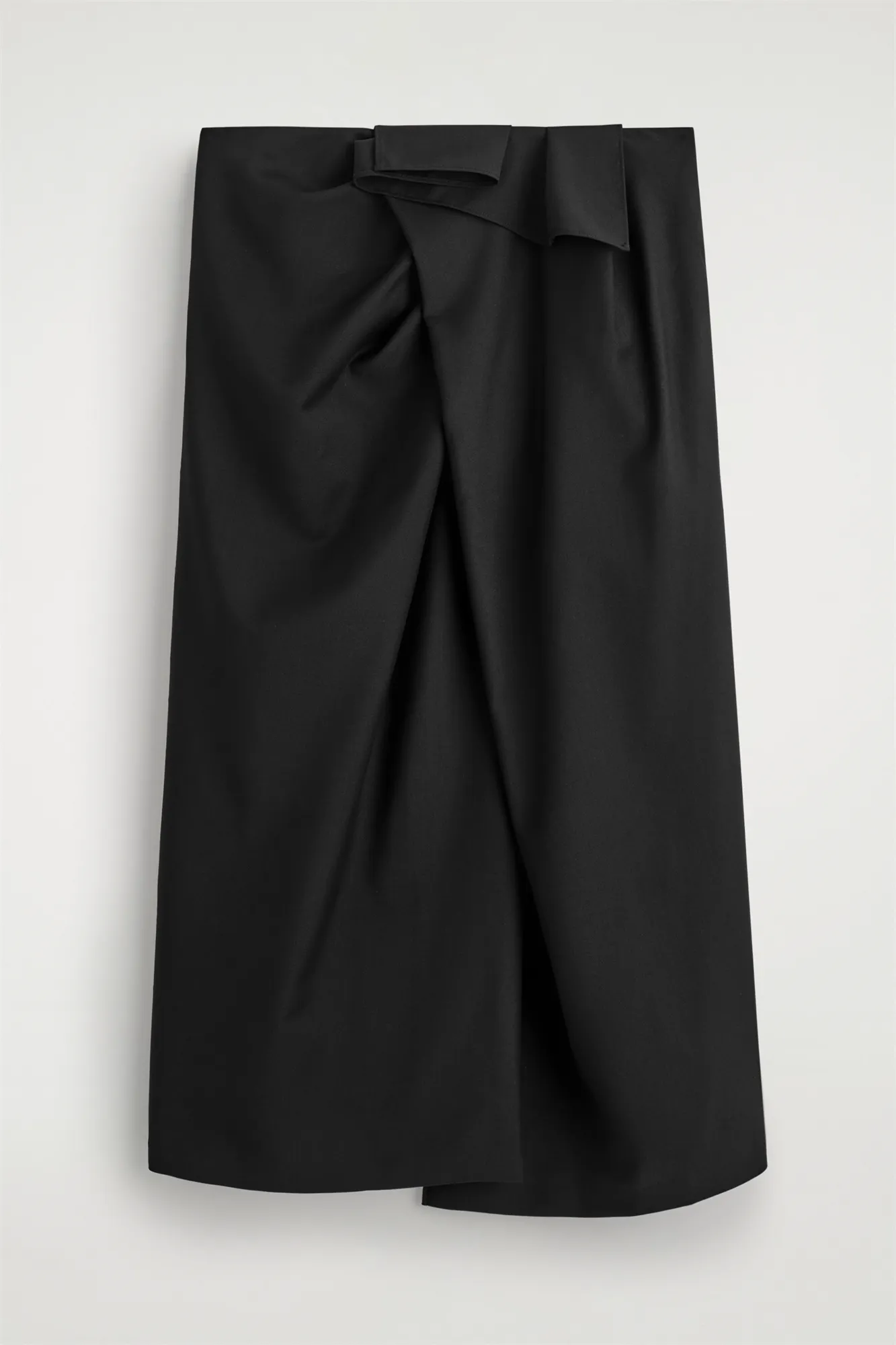 Эта современная юбка, сшитая из фактурной шерсти RWS, имеет силуэт с запахом, драпировку и асимметричные оборки на поясе. Носите ее как часть монохромного образа.