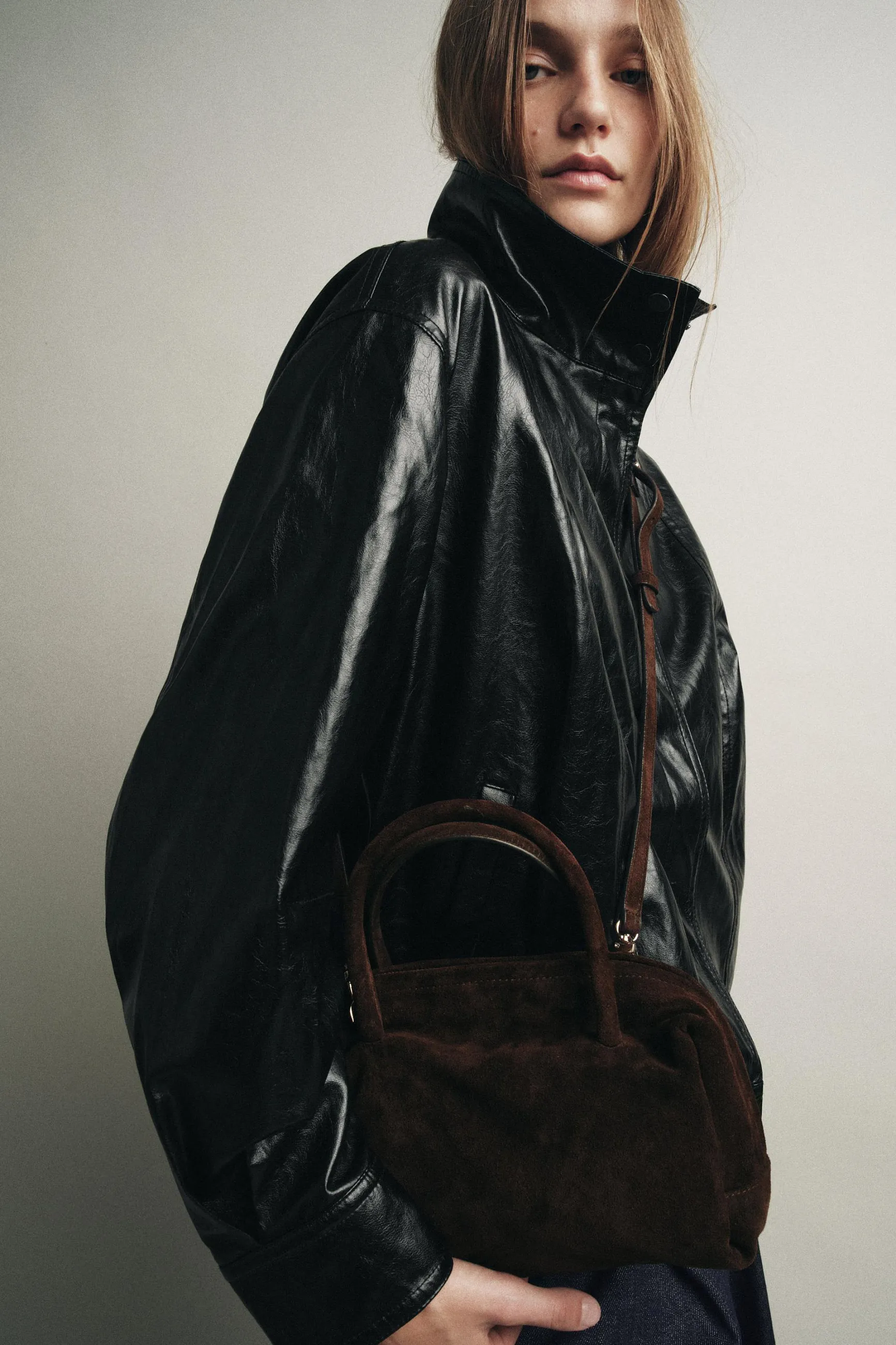 Сумка из замши. Двойные ручки сверху и съемный плечевой ремень. Внутренний карман на молнии. Двойная застежка-молния с бегунком.