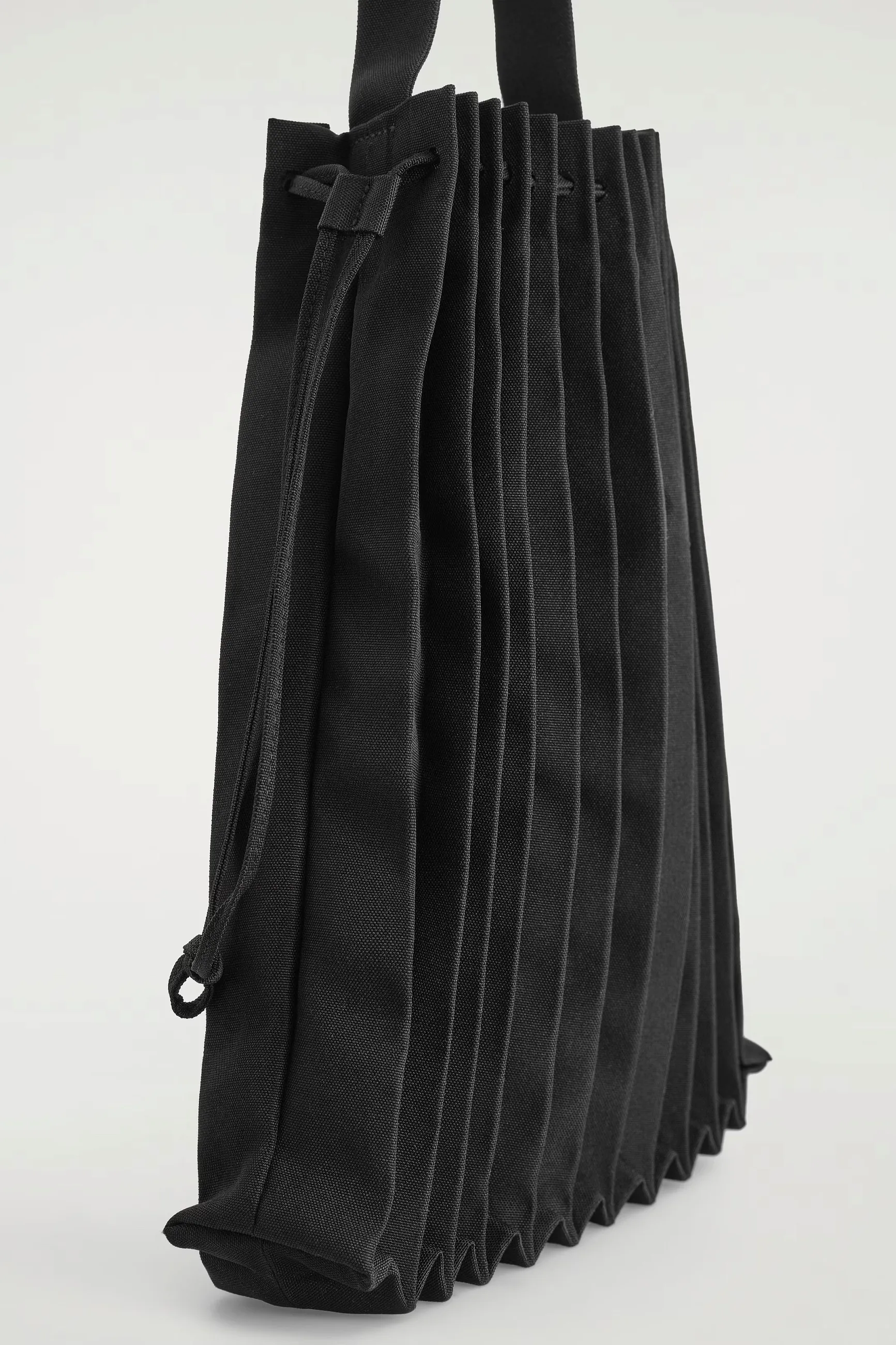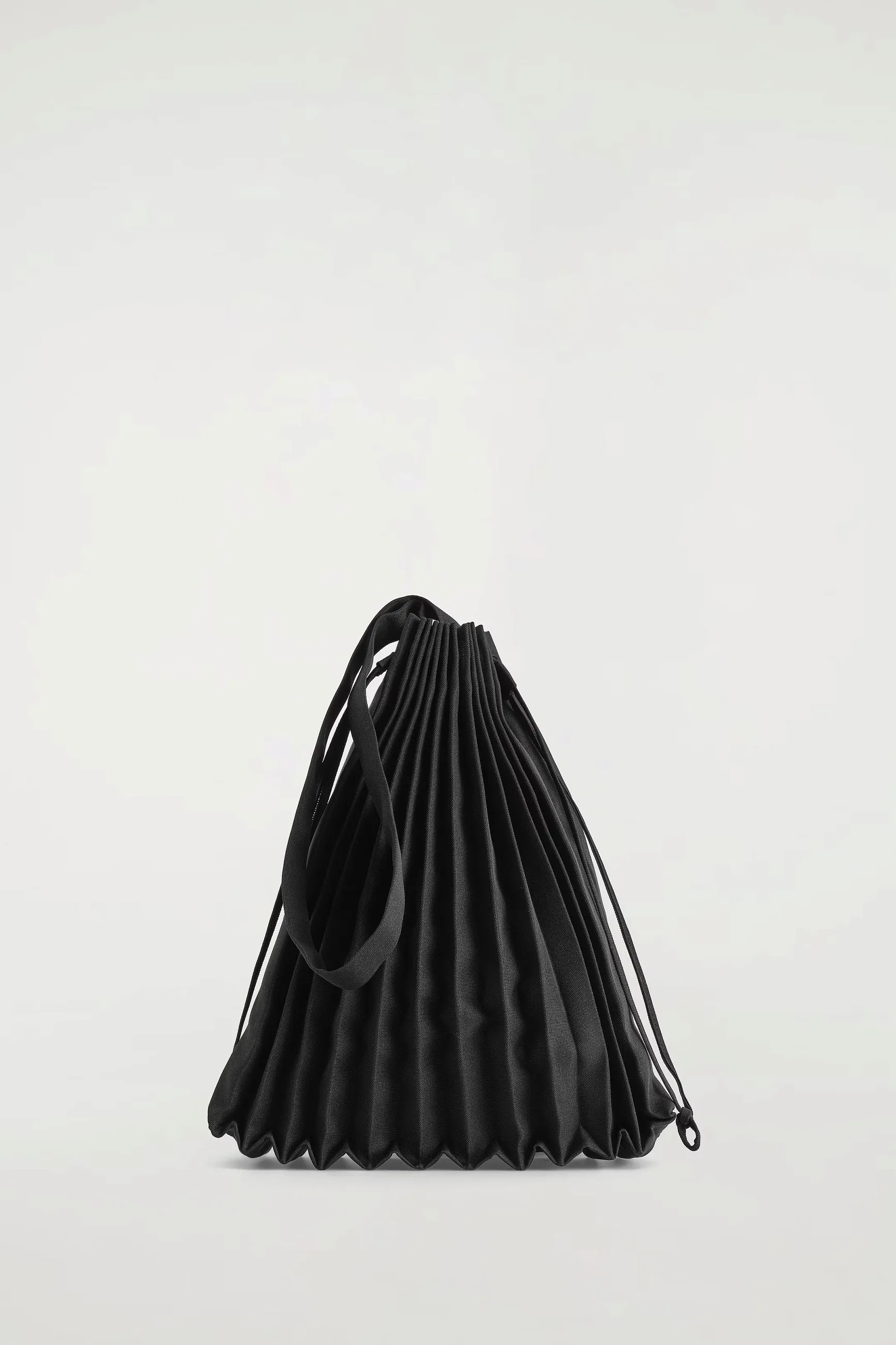 В этом сезоне мы обновили наши классические аксессуары. Черная холщовая сумка-аккордеон имеет два завязанных шнурка, которые создают расправленный силуэт. Тональный ремешок позволяет носить ее на плече.