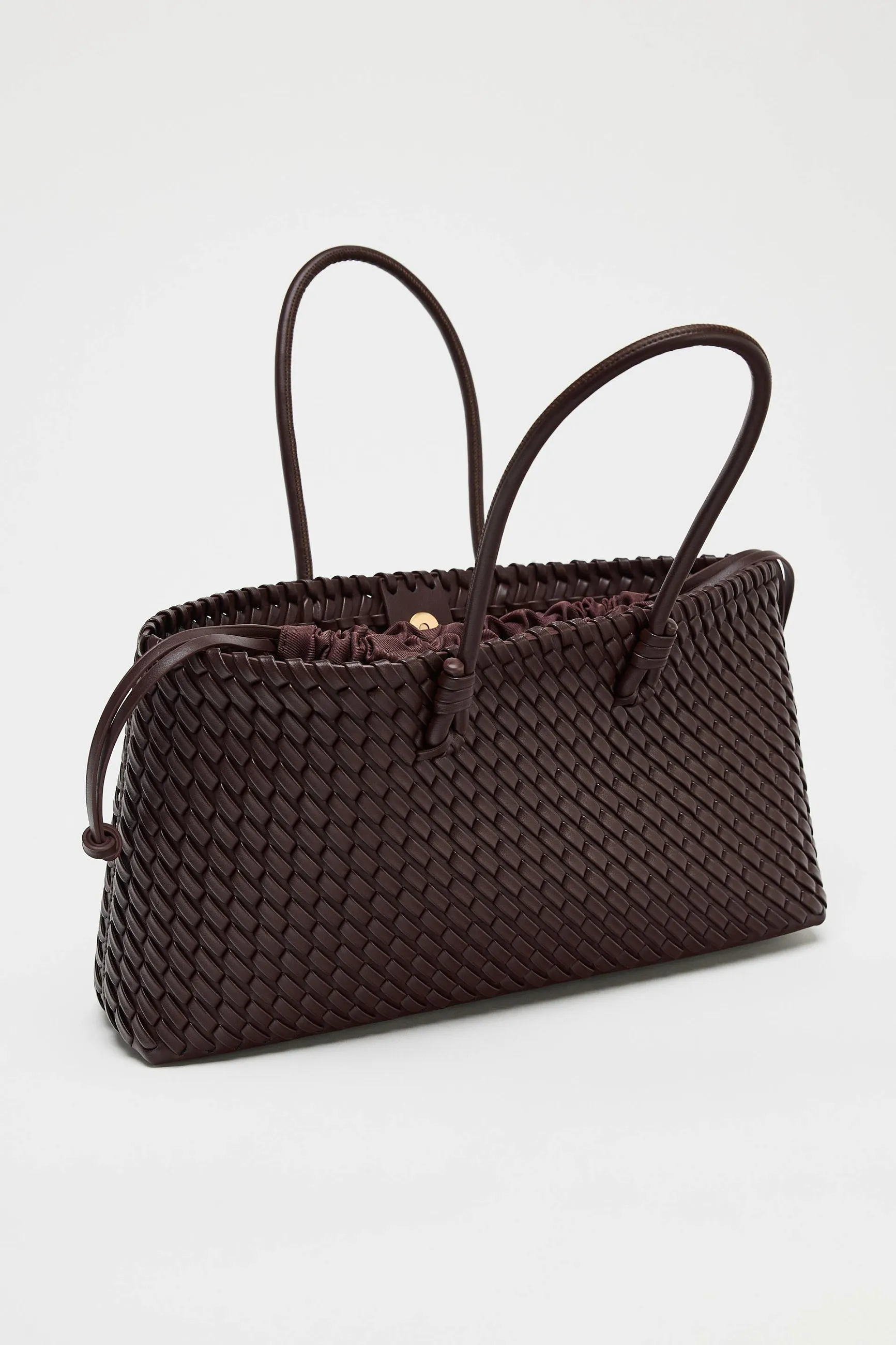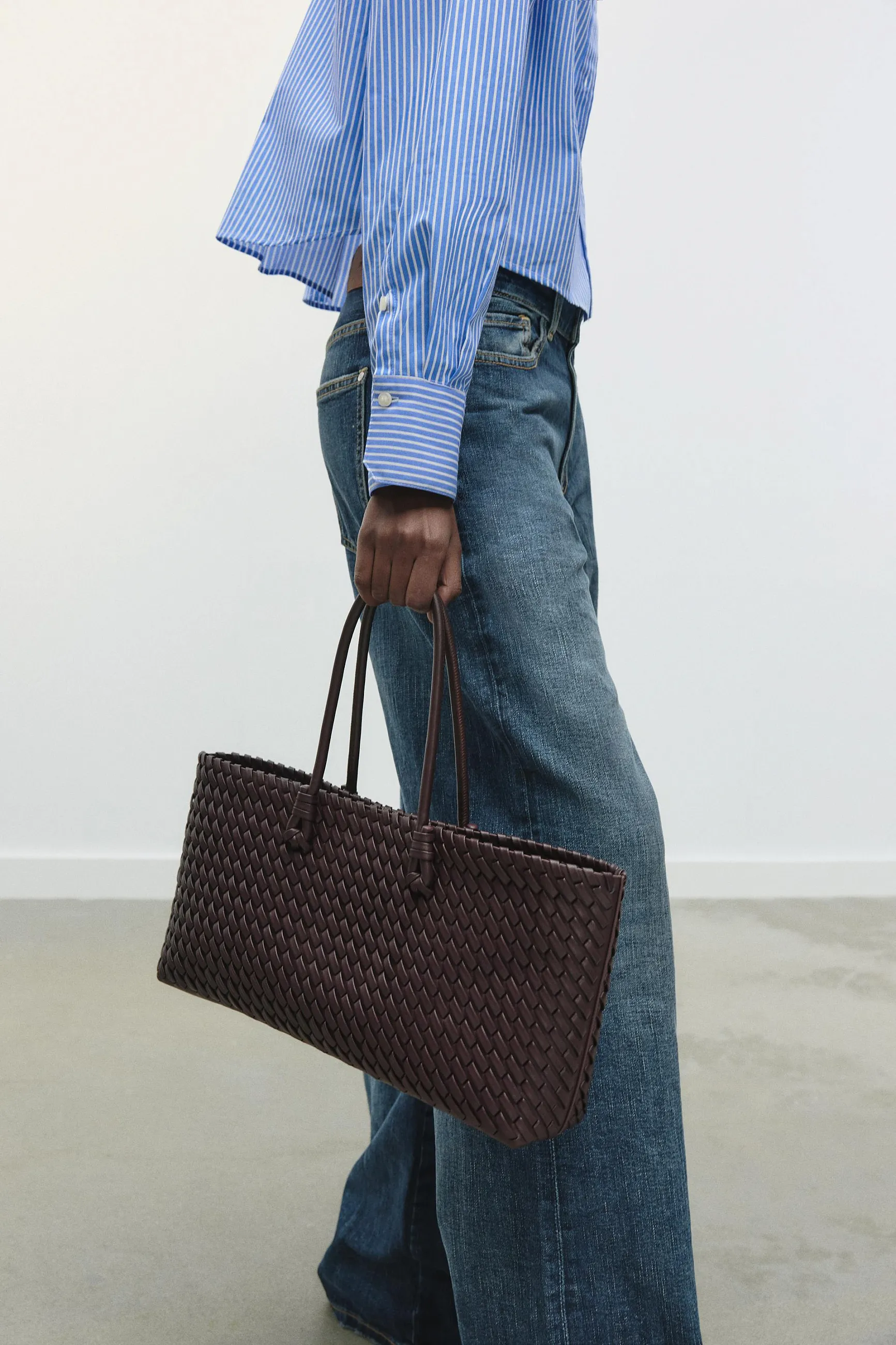 Удлиненная сумка-тоут с плетеным верхом. Плечевой ремень. Внутренний карман с застежкой-шнурком. Магнитная застежка.