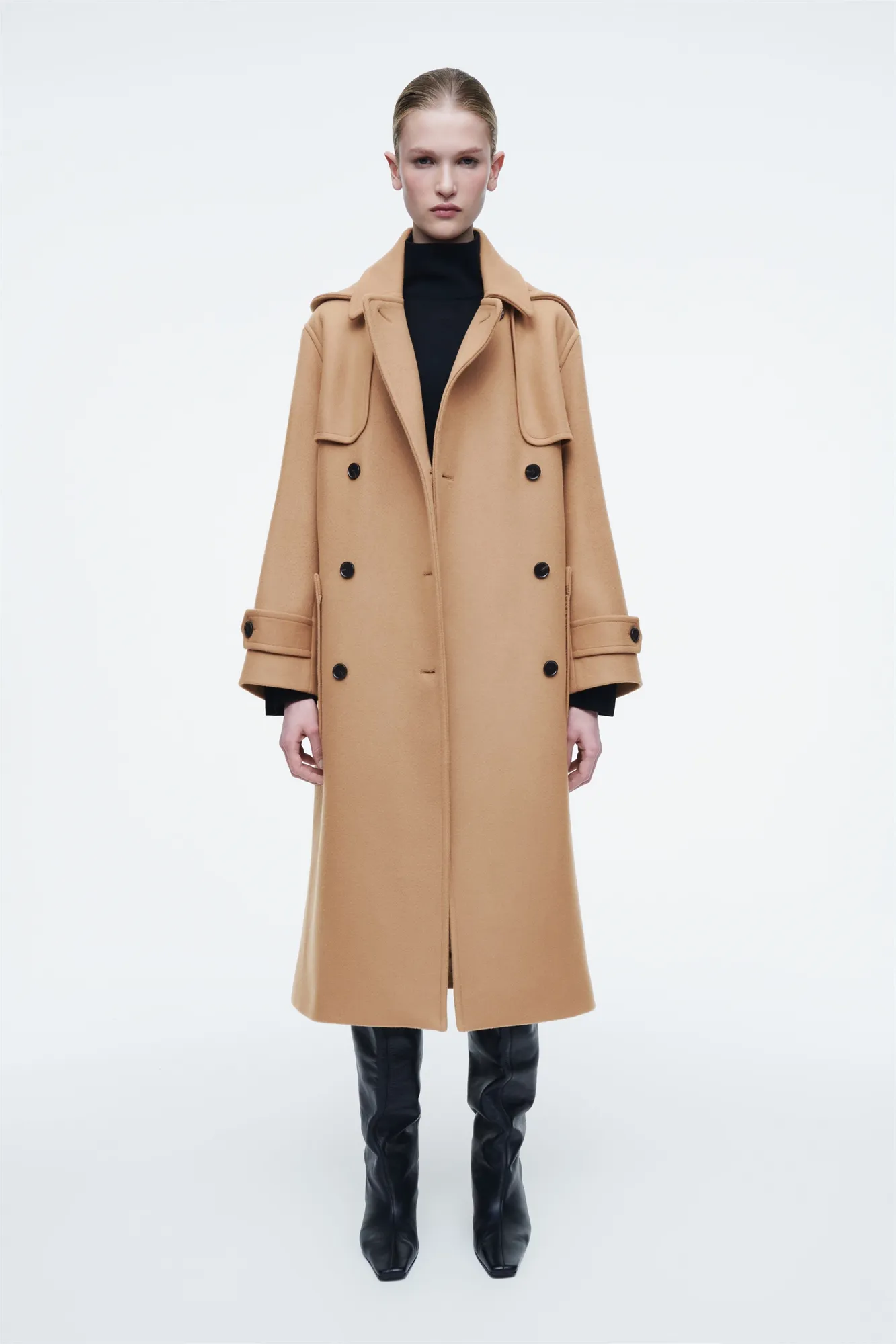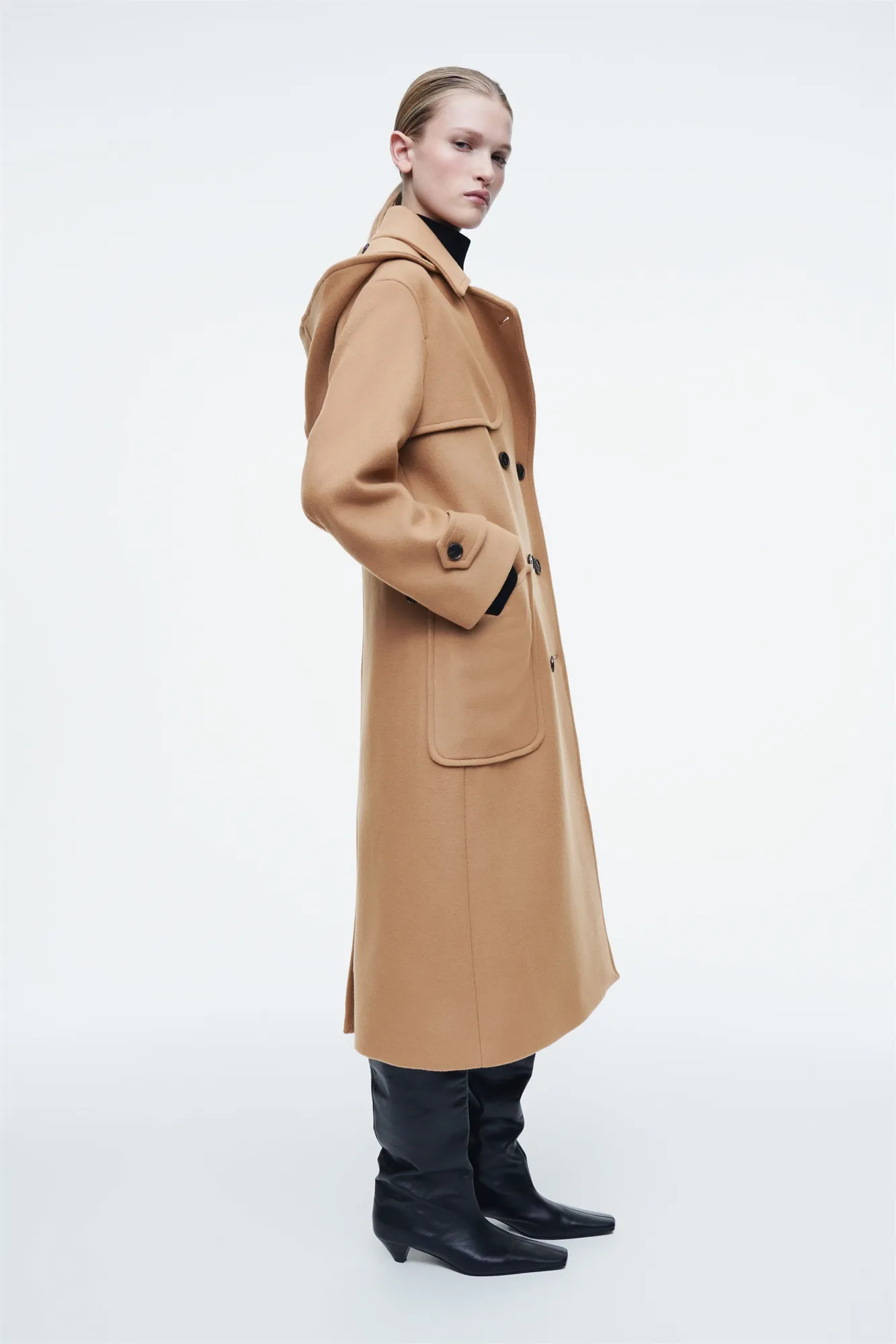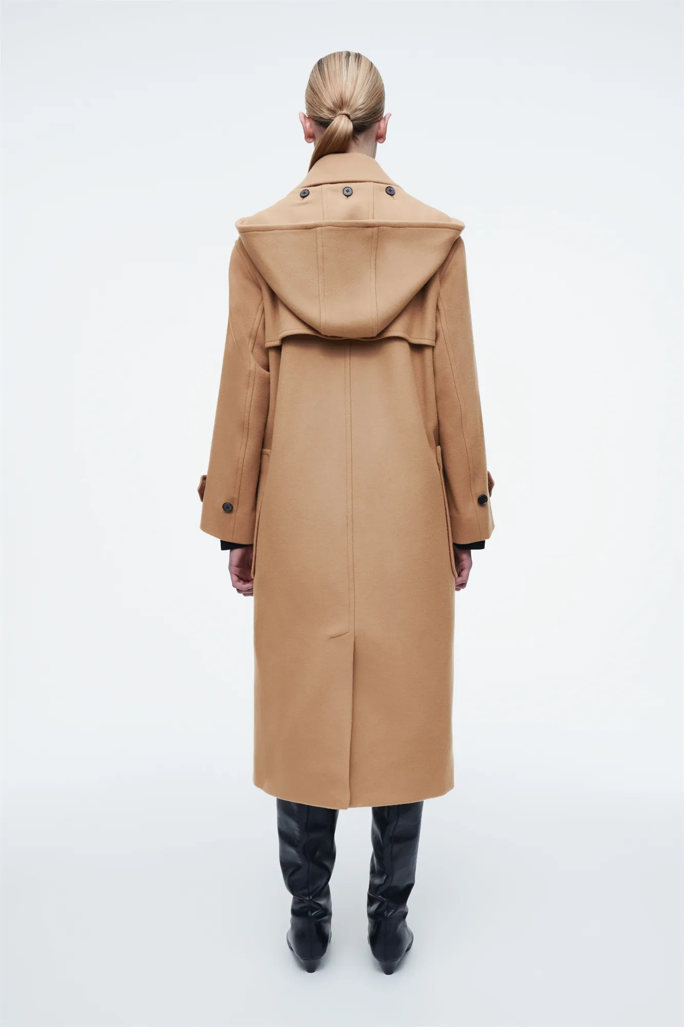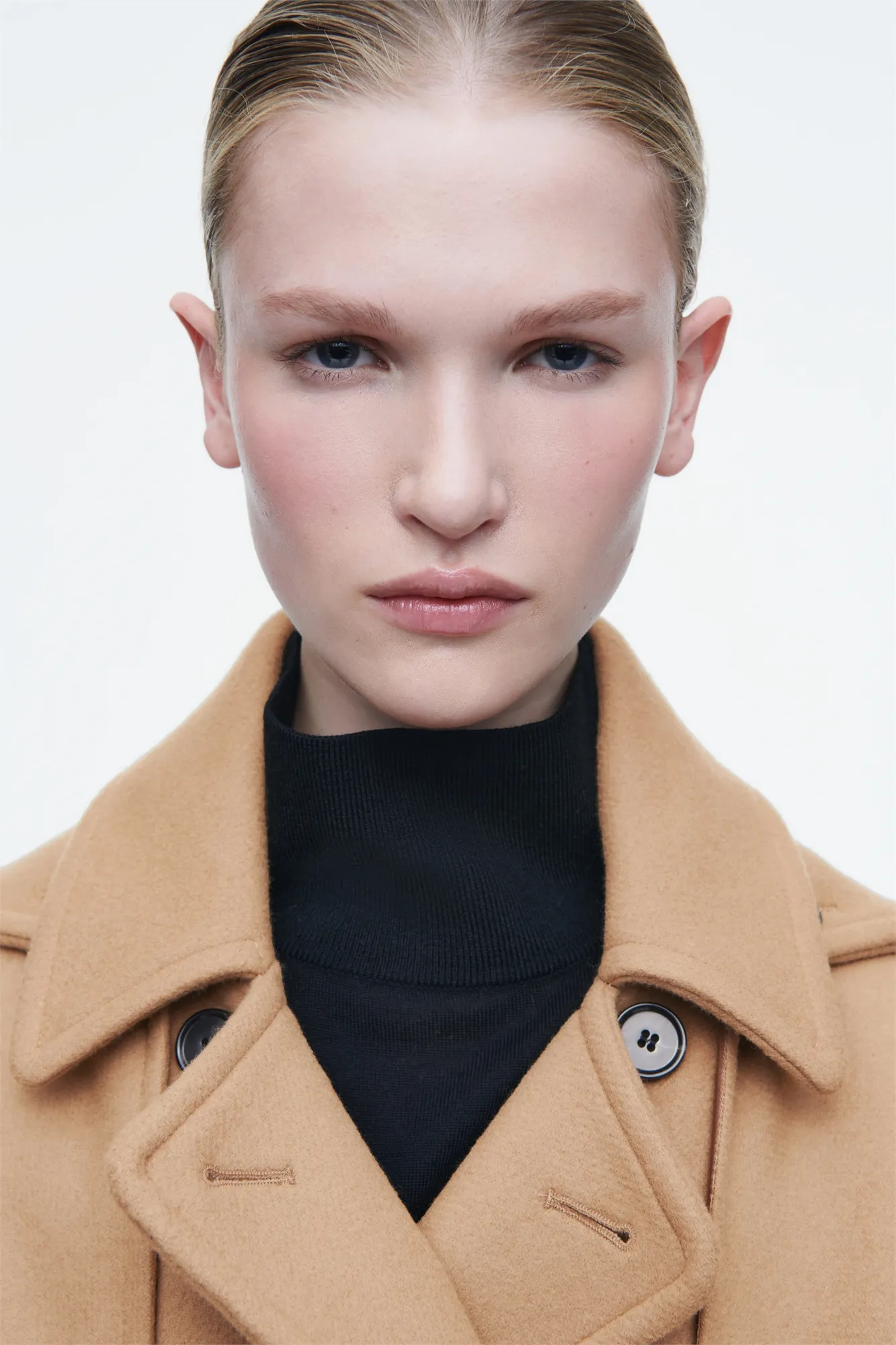 Дафлкот COS подчеркивает изысканную чувственность. Он выполнен в вечном верблюжьем оттенке и имеет заостренный воротник, двубортную складку и ветрозащитный клапан, которые заимствованы у классического тренча. Ткань из переработанной шерсти обеспечивает тепло в прохладную погоду, как и обволакивающий капюшон и регулируемые манжеты.