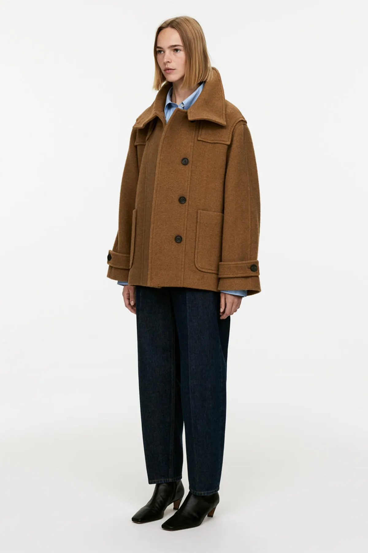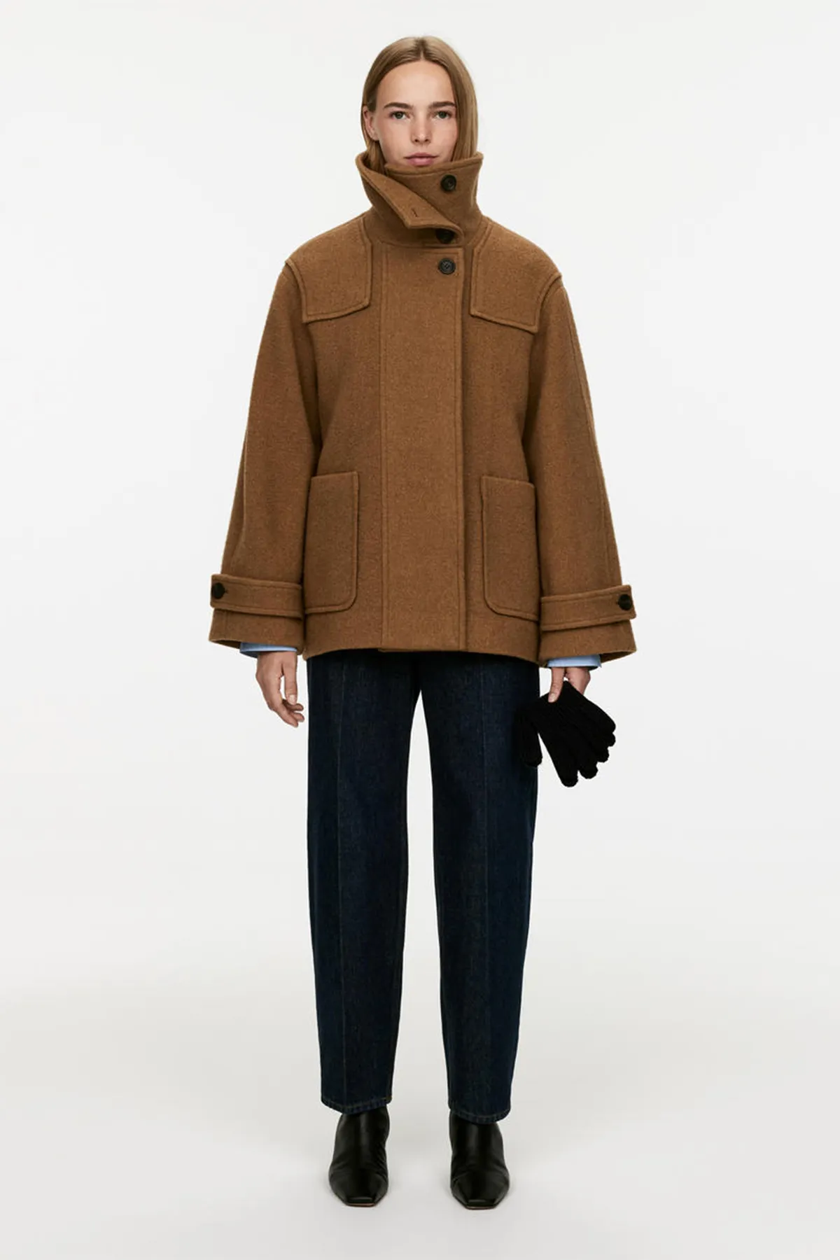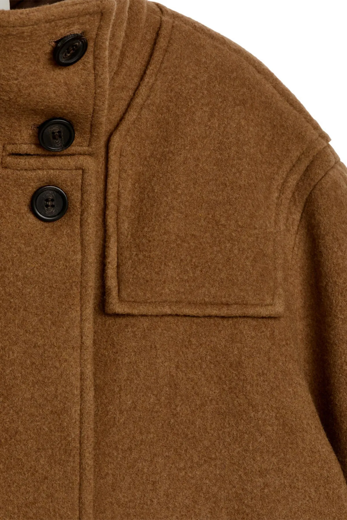 Полупальто из смесовой шерсти с застежкой на пуговицы и передними накладными карманами. Хлястики на концах рукавов и высокий воротник с застежкой на пуговицы. Полностью на подкладке.