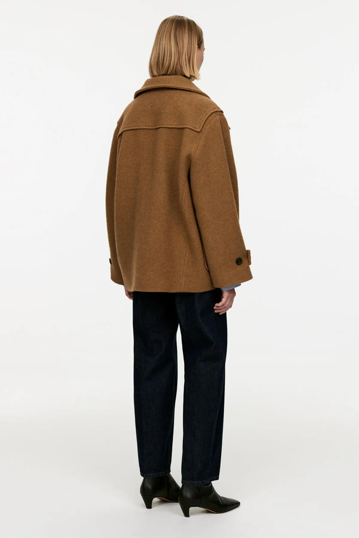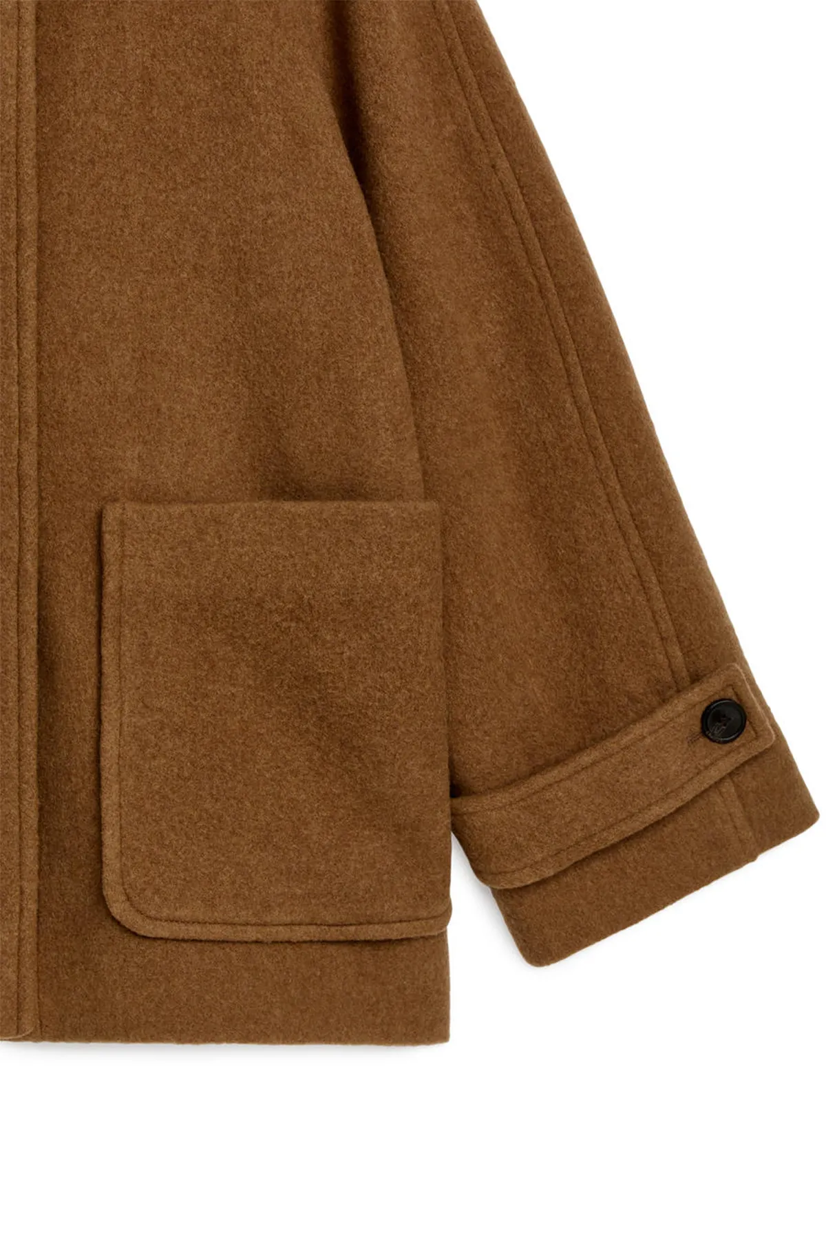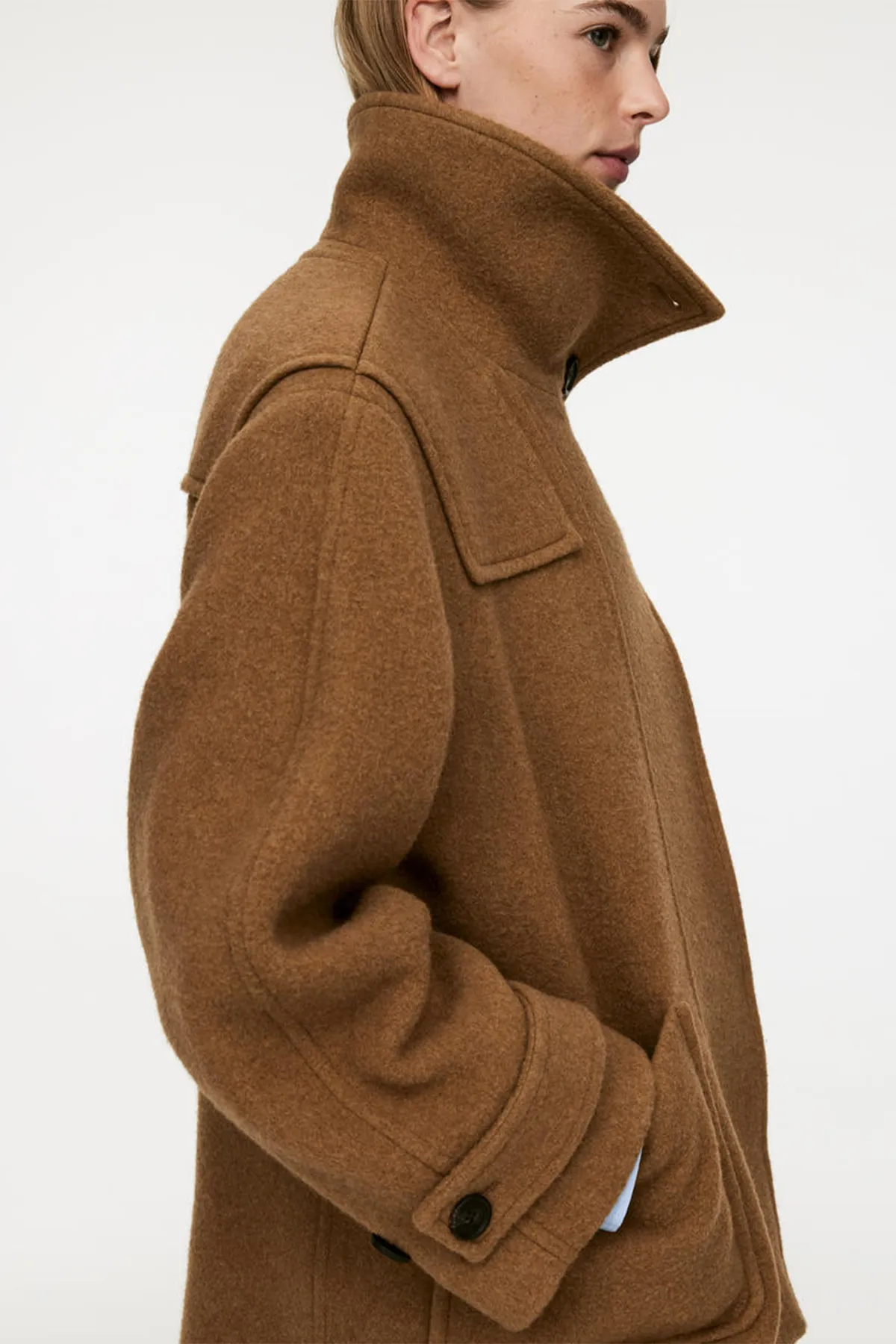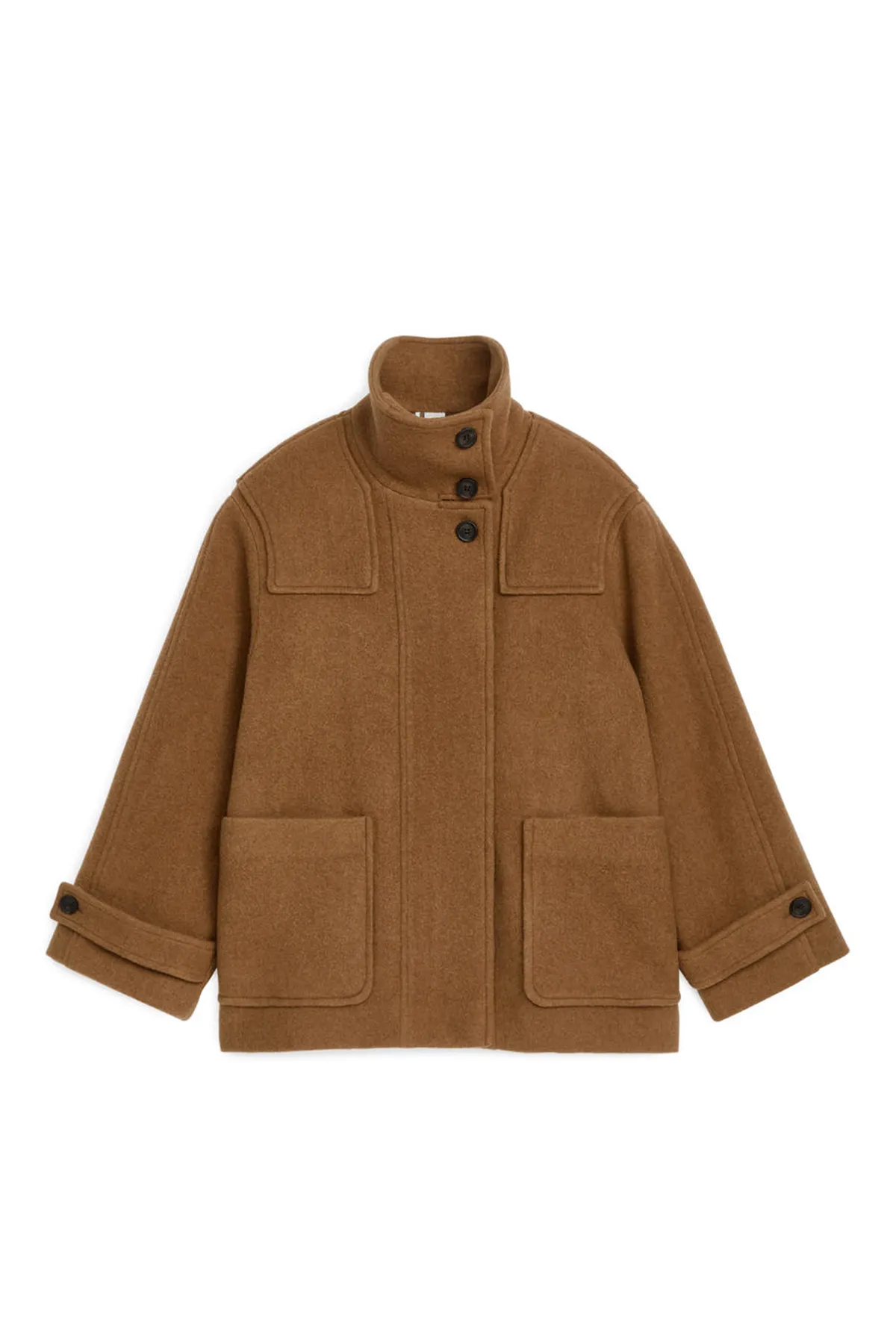 Полупальто из смесовой шерсти с застежкой на пуговицы и передними накладными карманами. Хлястики на концах рукавов и высокий воротник с застежкой на пуговицы. Полностью на подкладке.