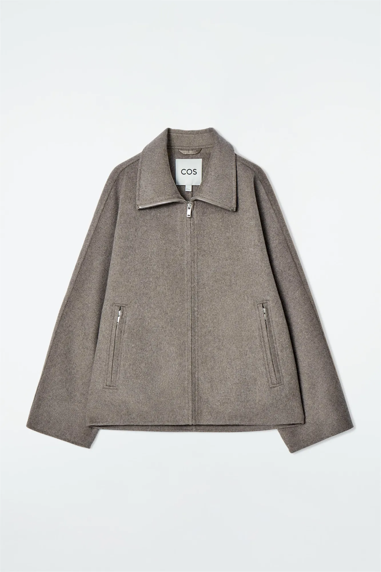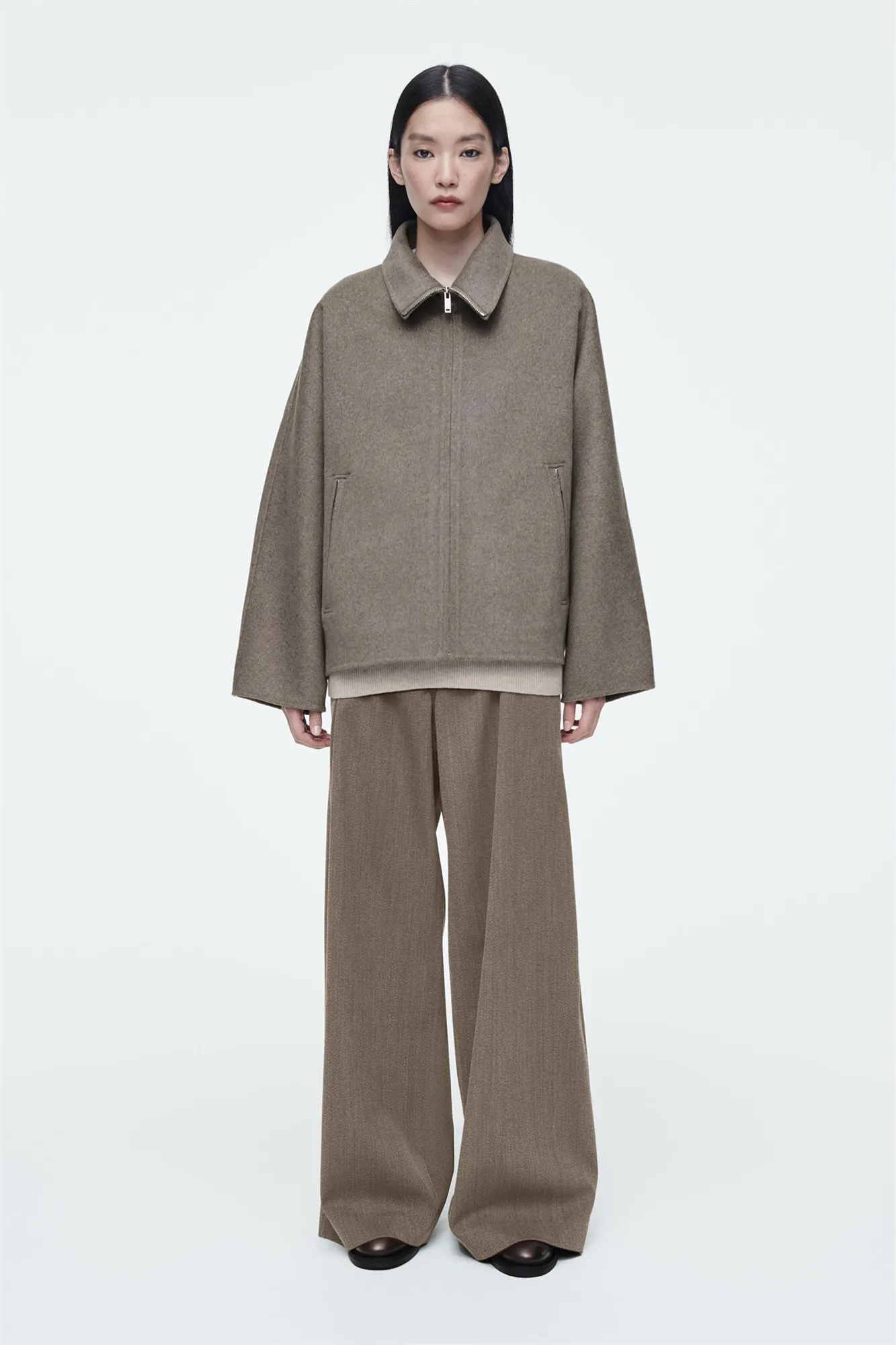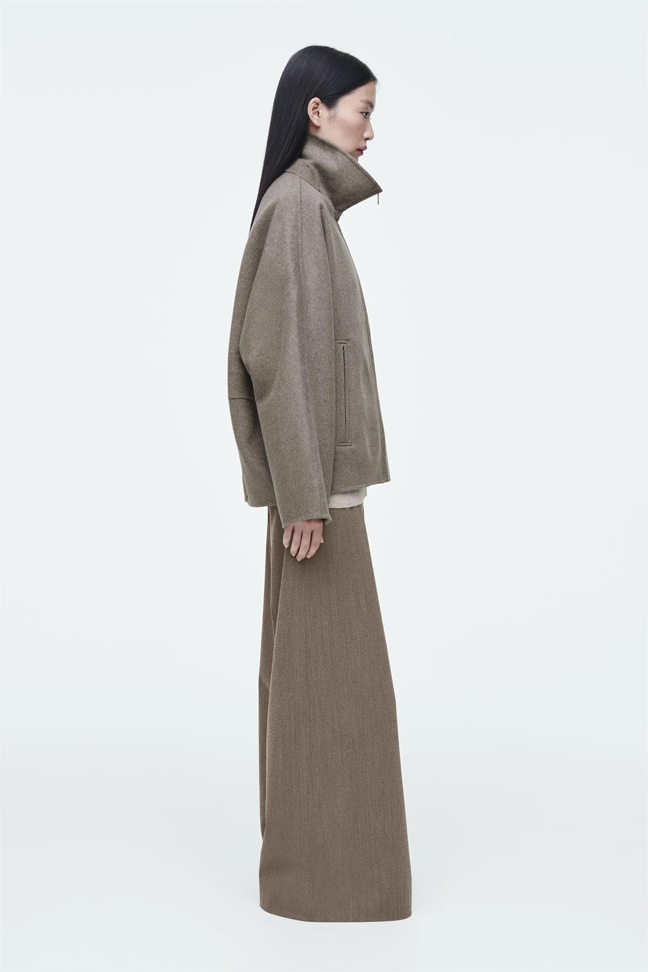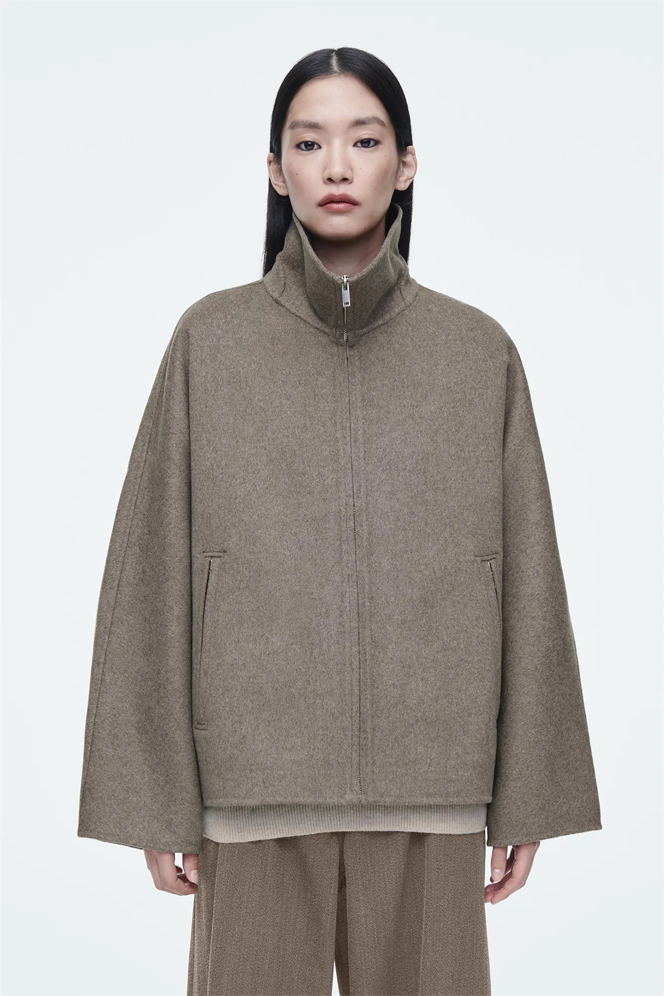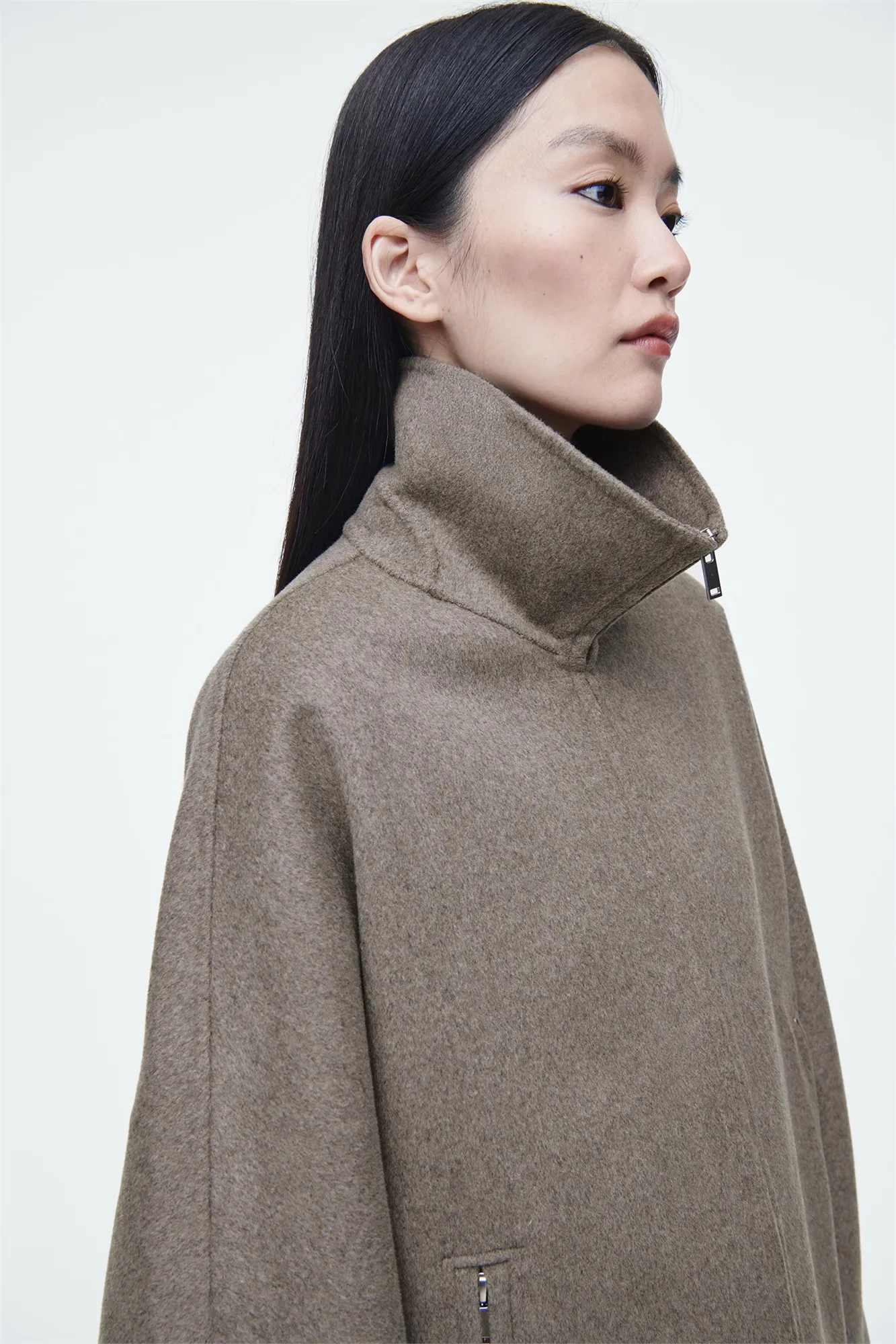 Это пальто, созданное из шерстяной смеси, очень теплое и легкое. Пальто с оверсайз-силуэтом, заостренным воротником, переходящим в воронку, выполнено в земляном серо-коричневом цвете. Модель дополнена втачными карманами на молнии и акцентами серебряного цвета.