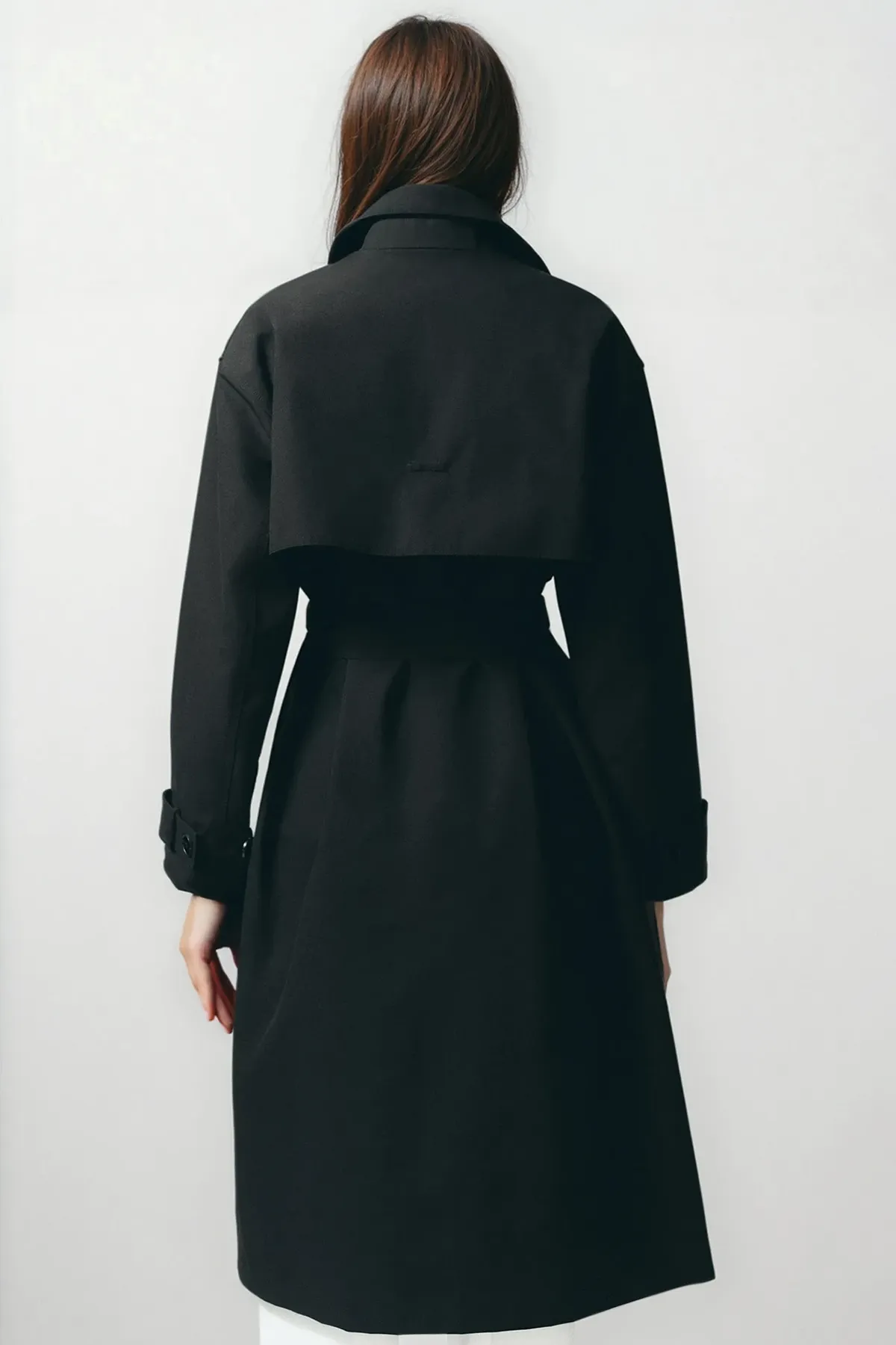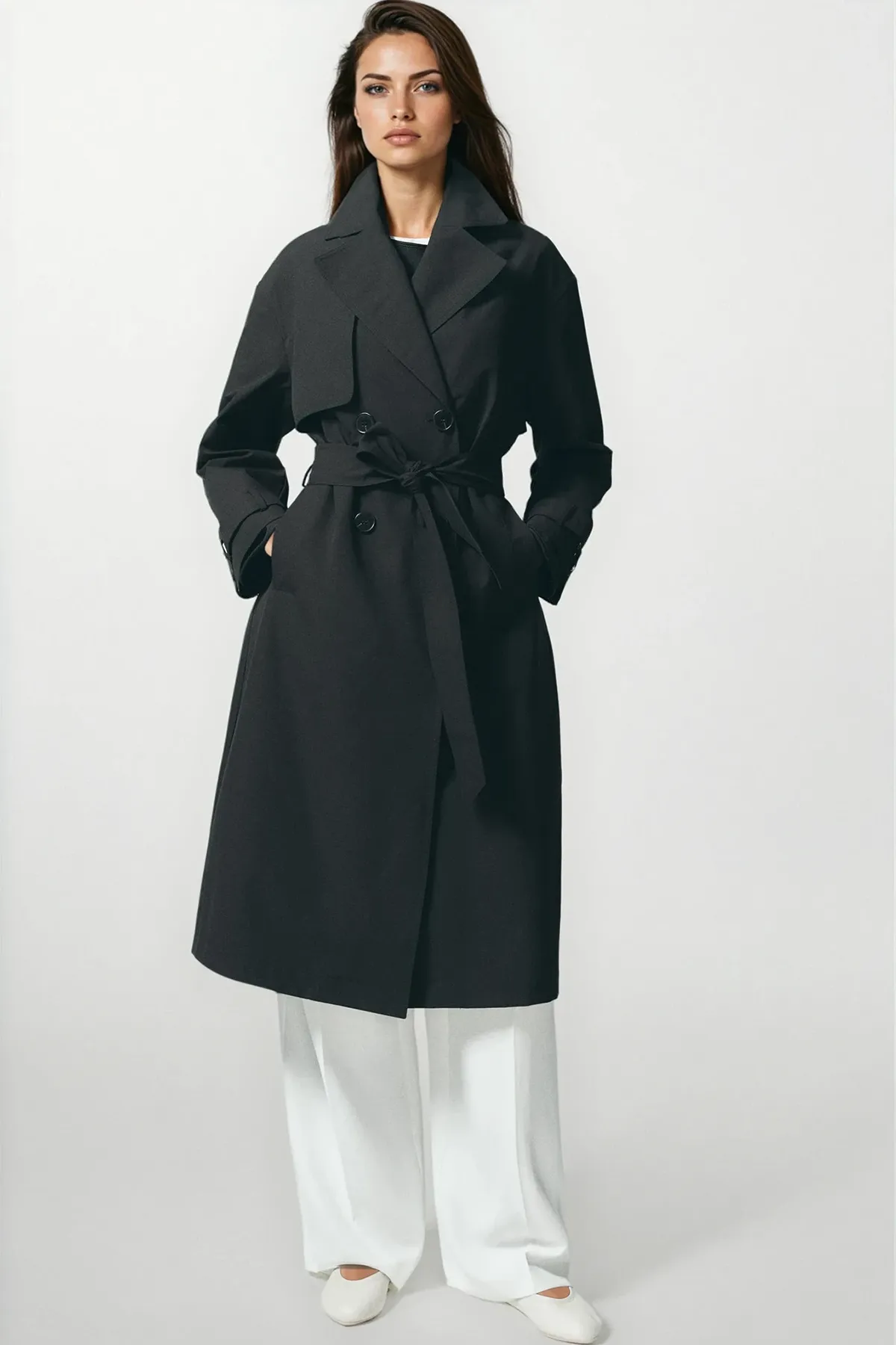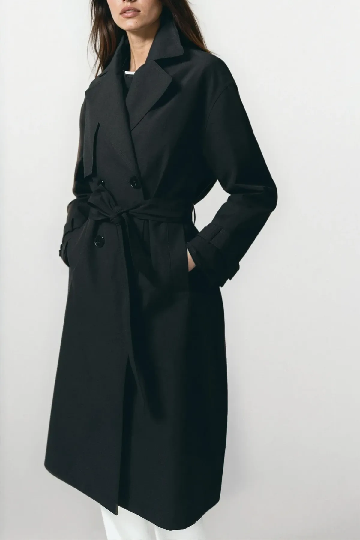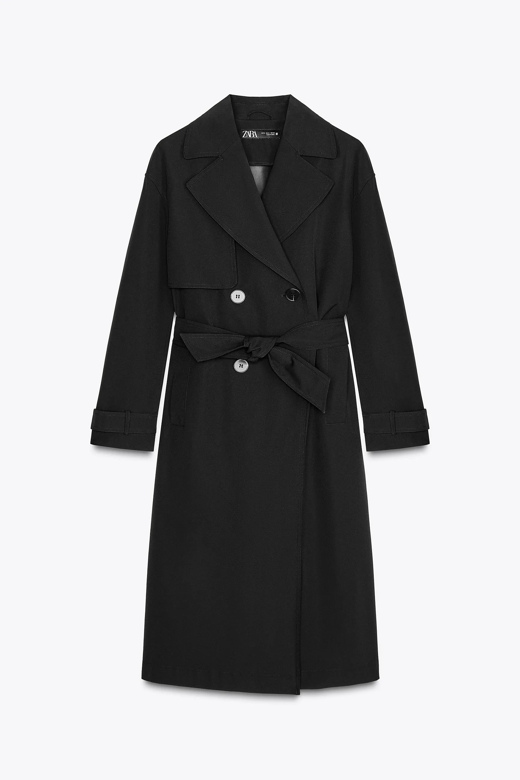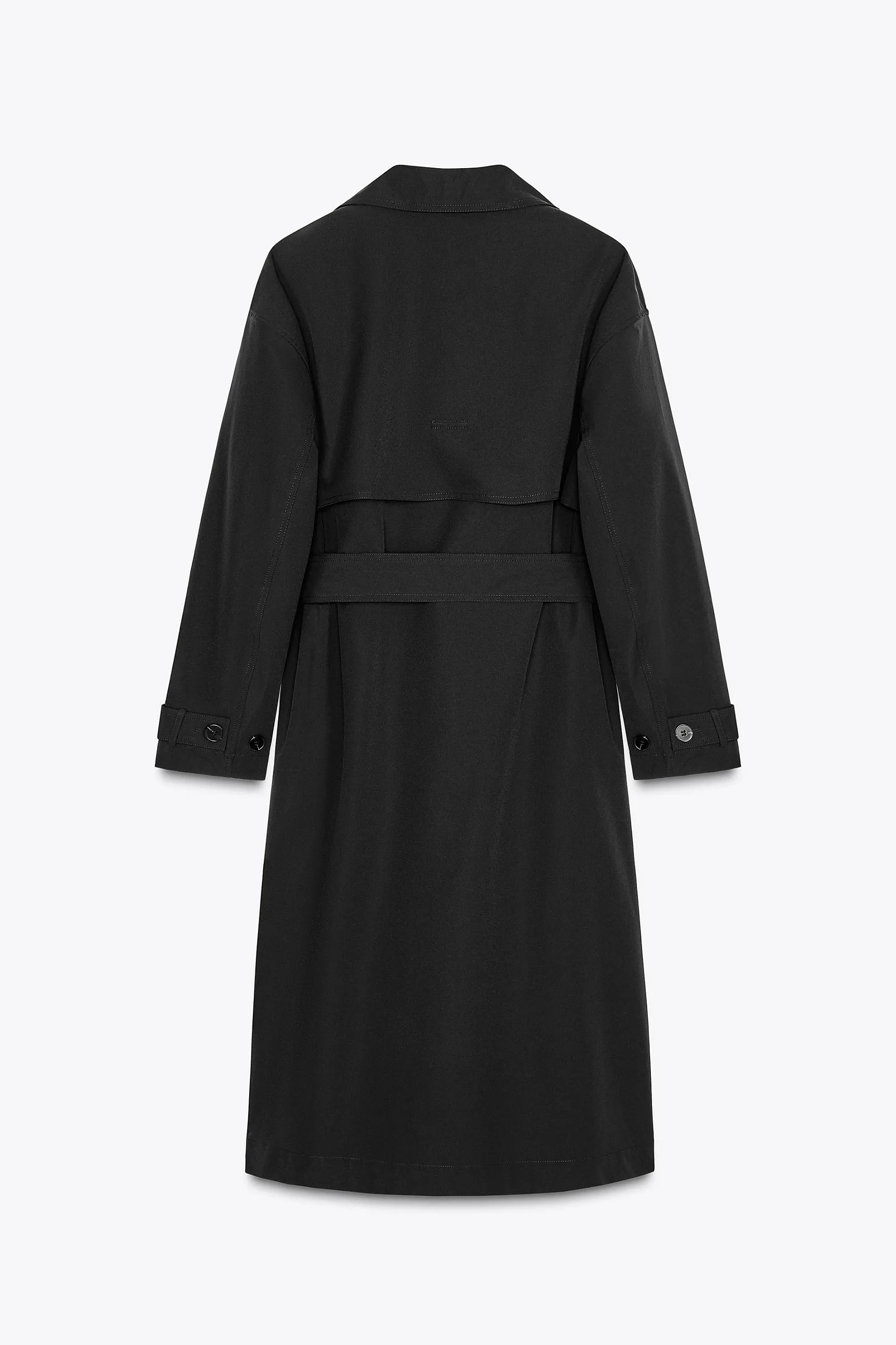 Водоотталкивающий тренчкот с воротником-лацканом и длинными рукавами с застежкой на пуговицы и хлястиком. С передними прорезными карманами, двубортной застежкой на пуговицы и соответствующим поясом.