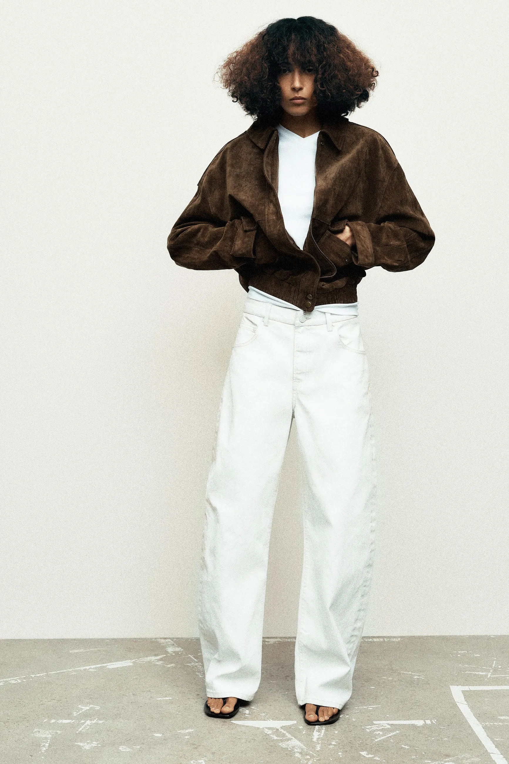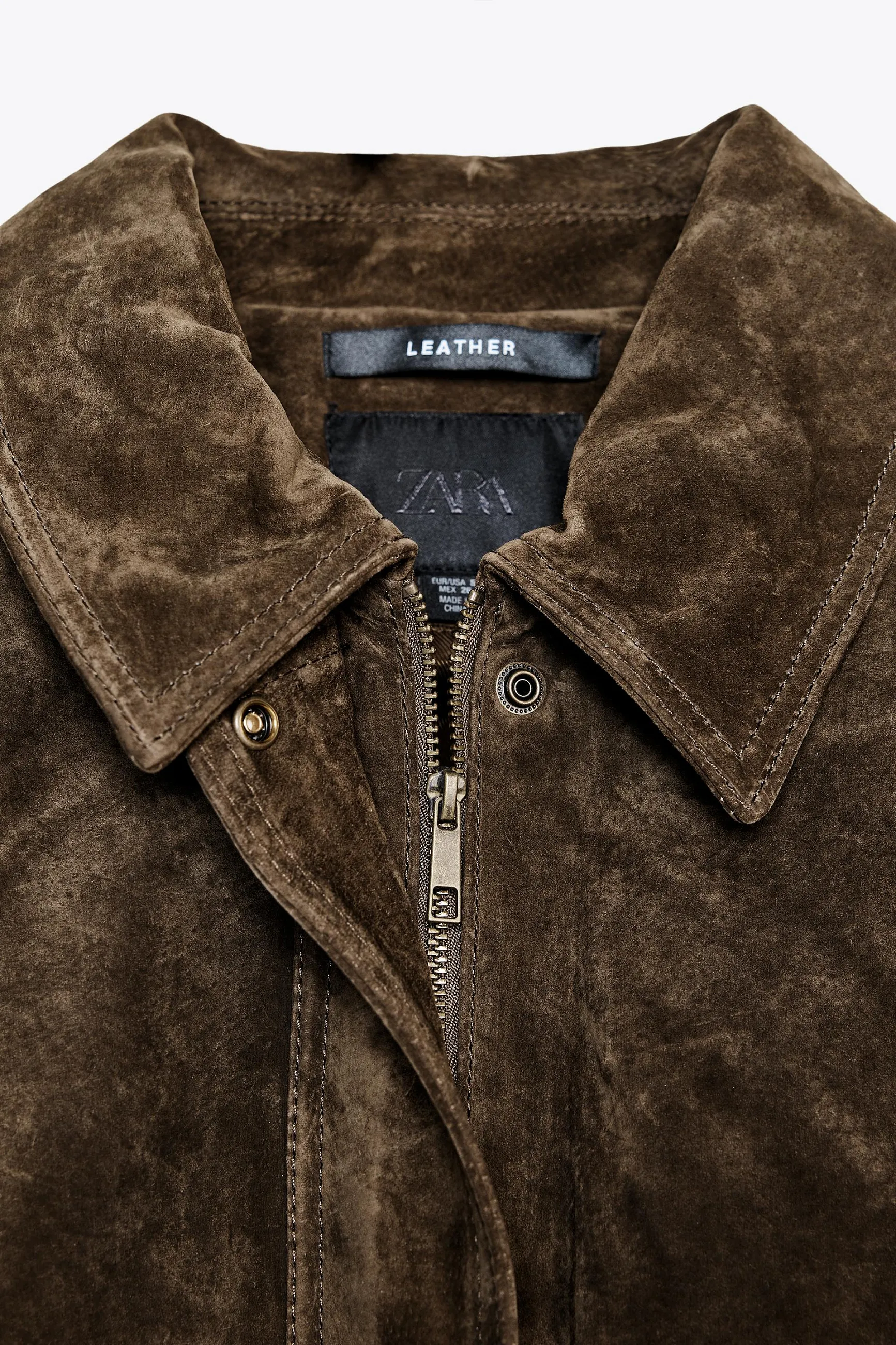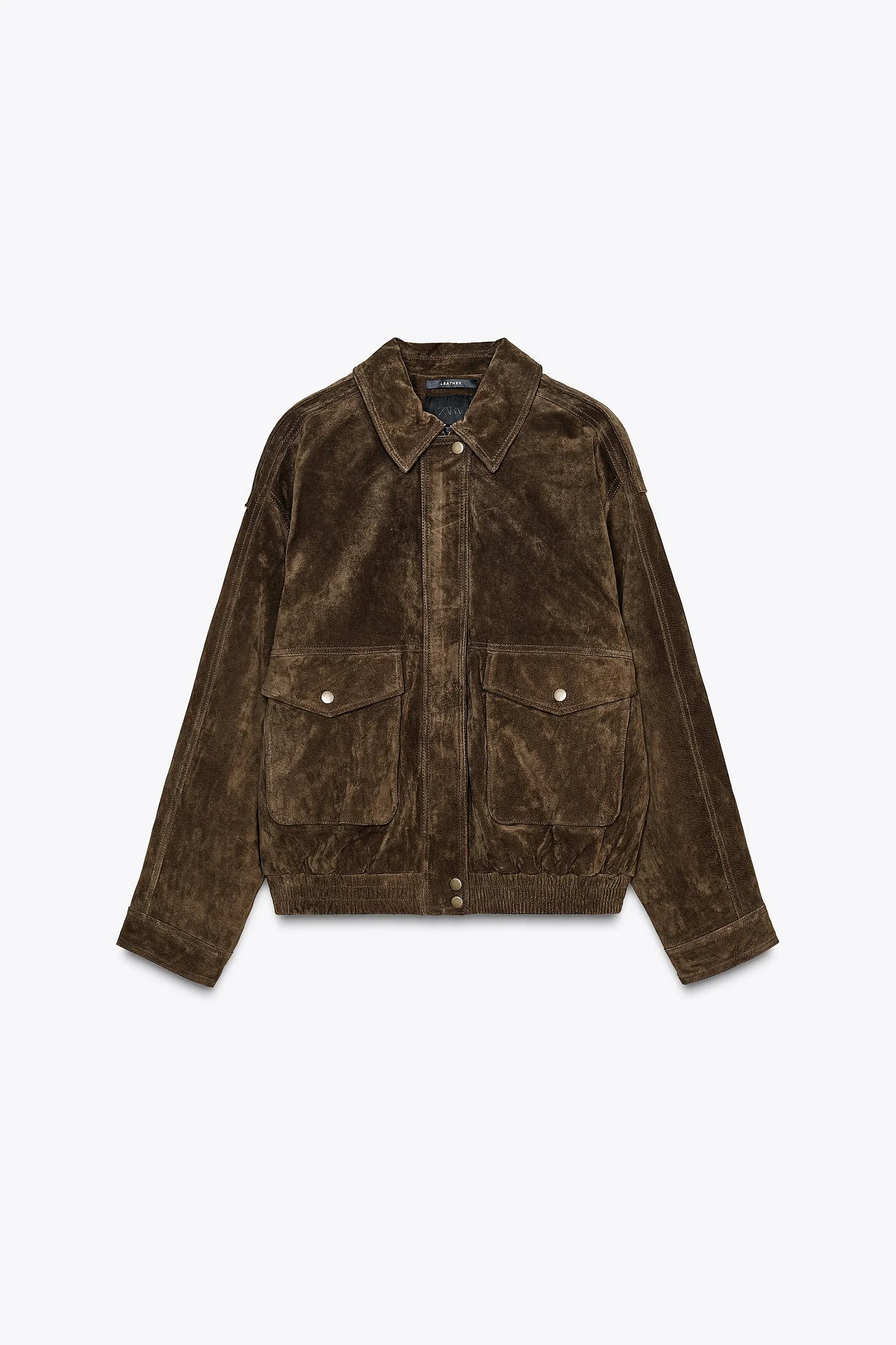 Бомбер из 100% замши с воротником и длинными рукавами. Хлястики на плечах, эластичный низ. Большие передние накладные карманы с клапанами и пуговицами, подкладка в тон. Застежка-молния под планкой с кнопками.