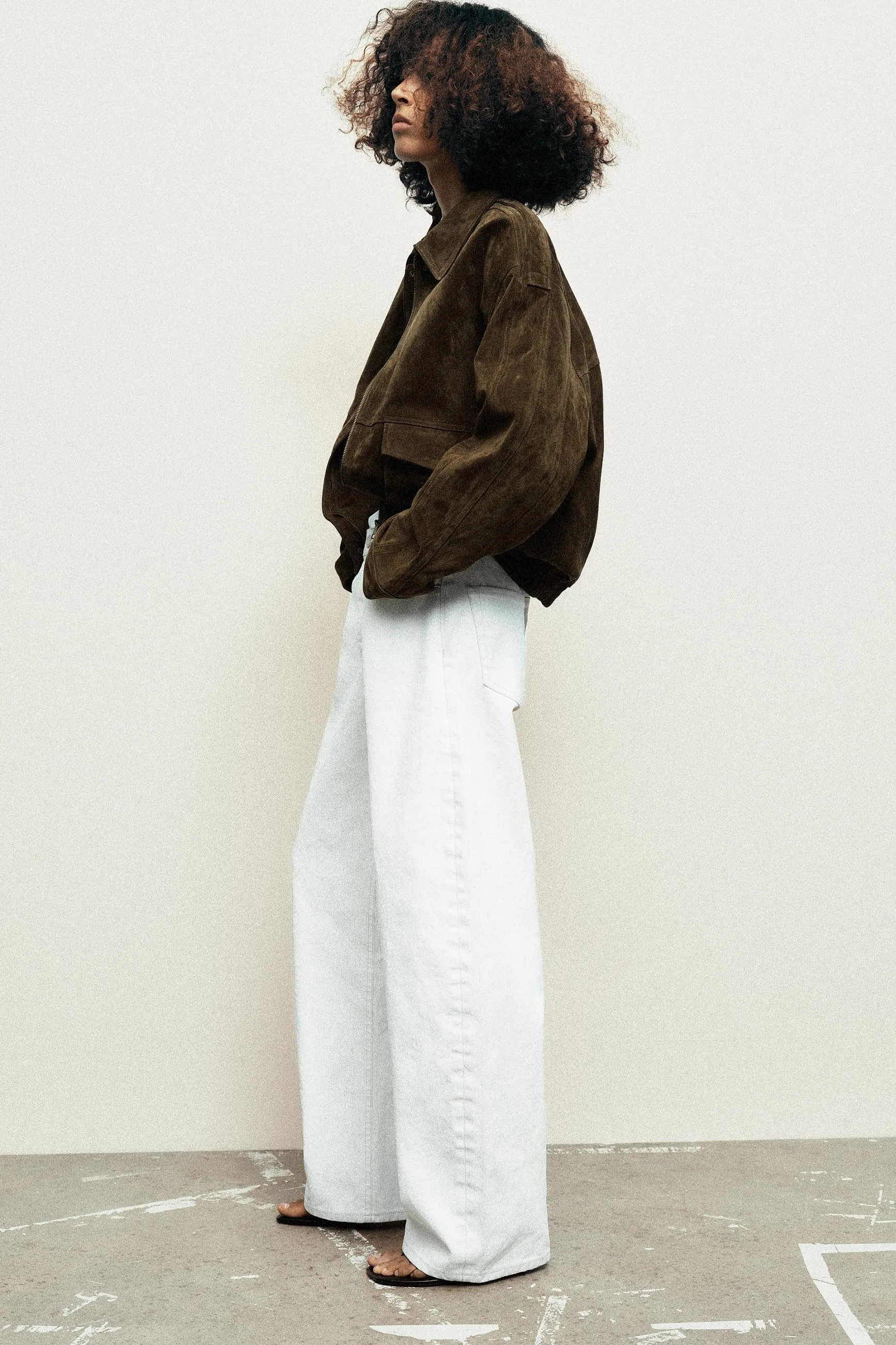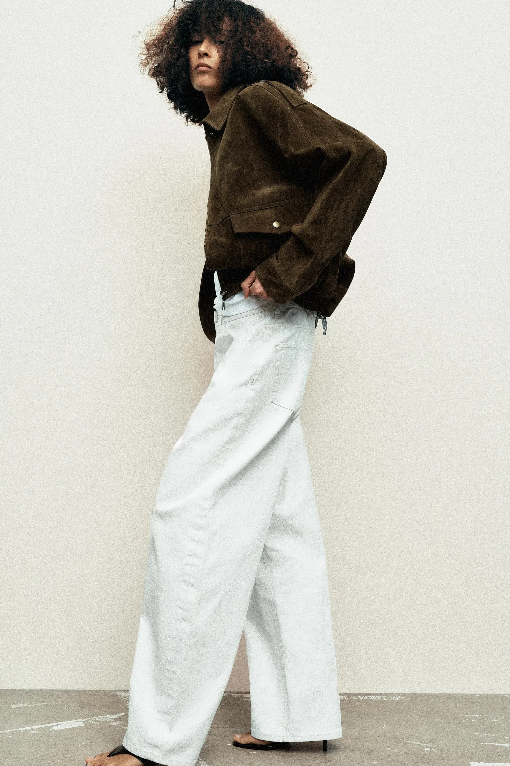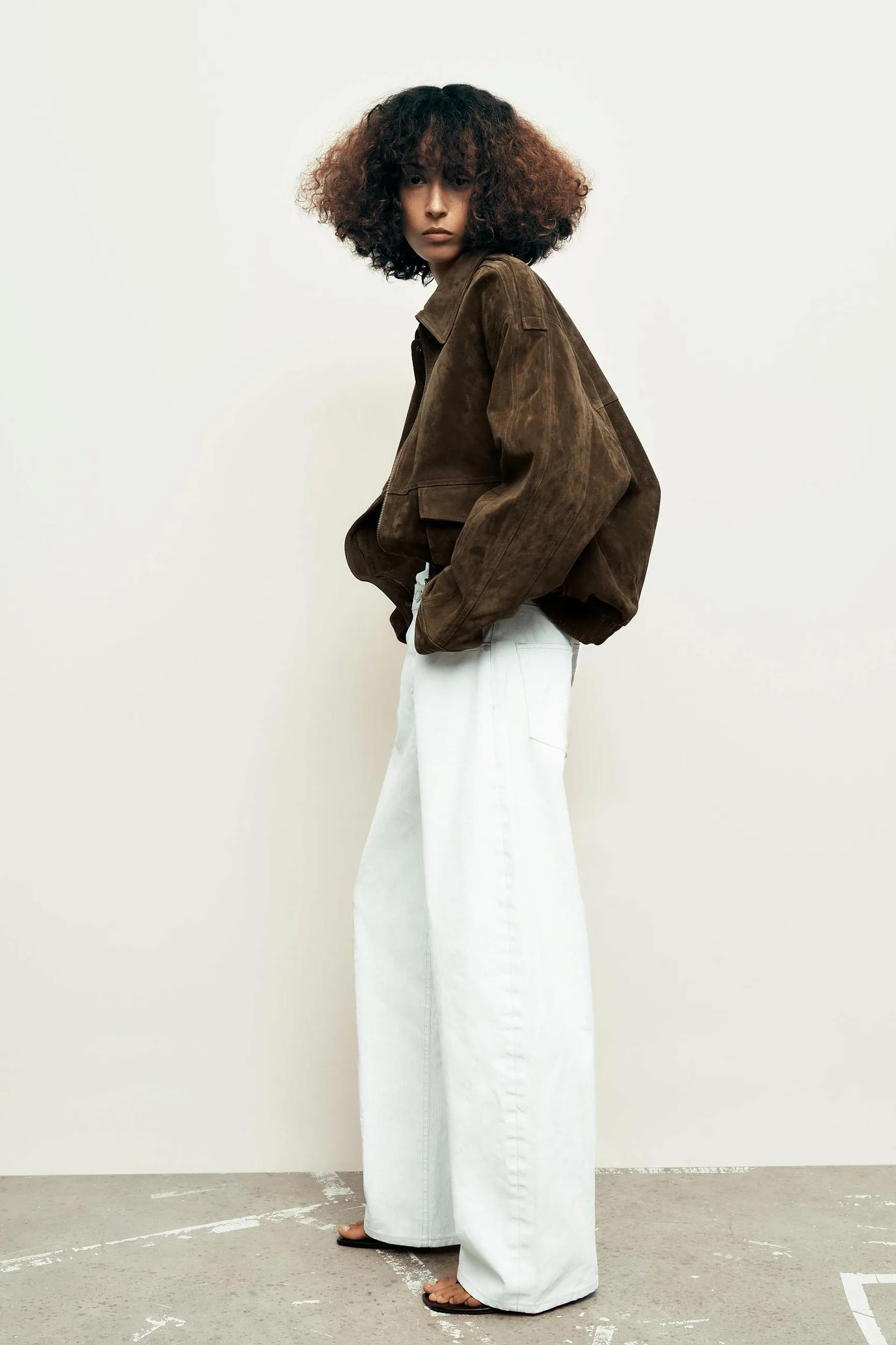 Бомбер из 100% замши с воротником и длинными рукавами. Хлястики на плечах, эластичный низ. Большие передние накладные карманы с клапанами и пуговицами, подкладка в тон. Застежка-молния под планкой с кнопками.