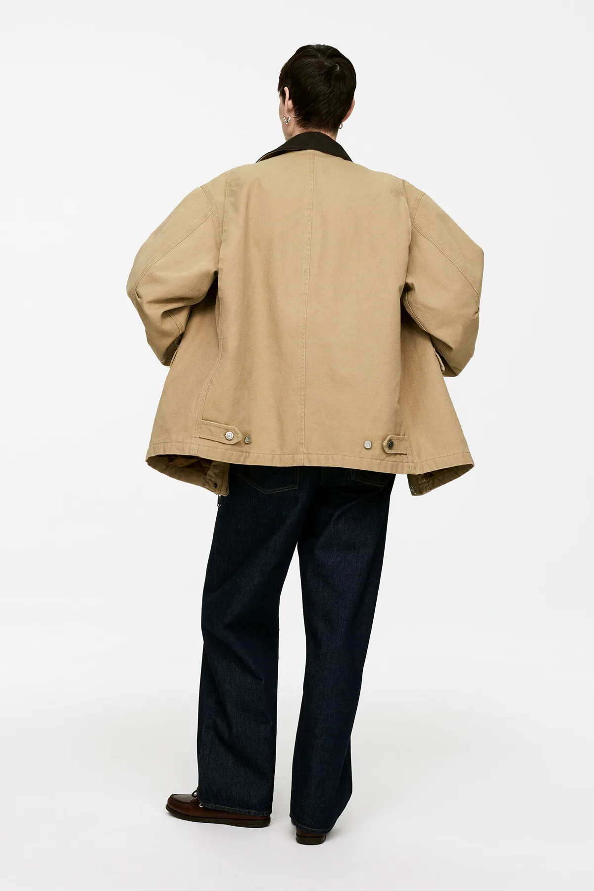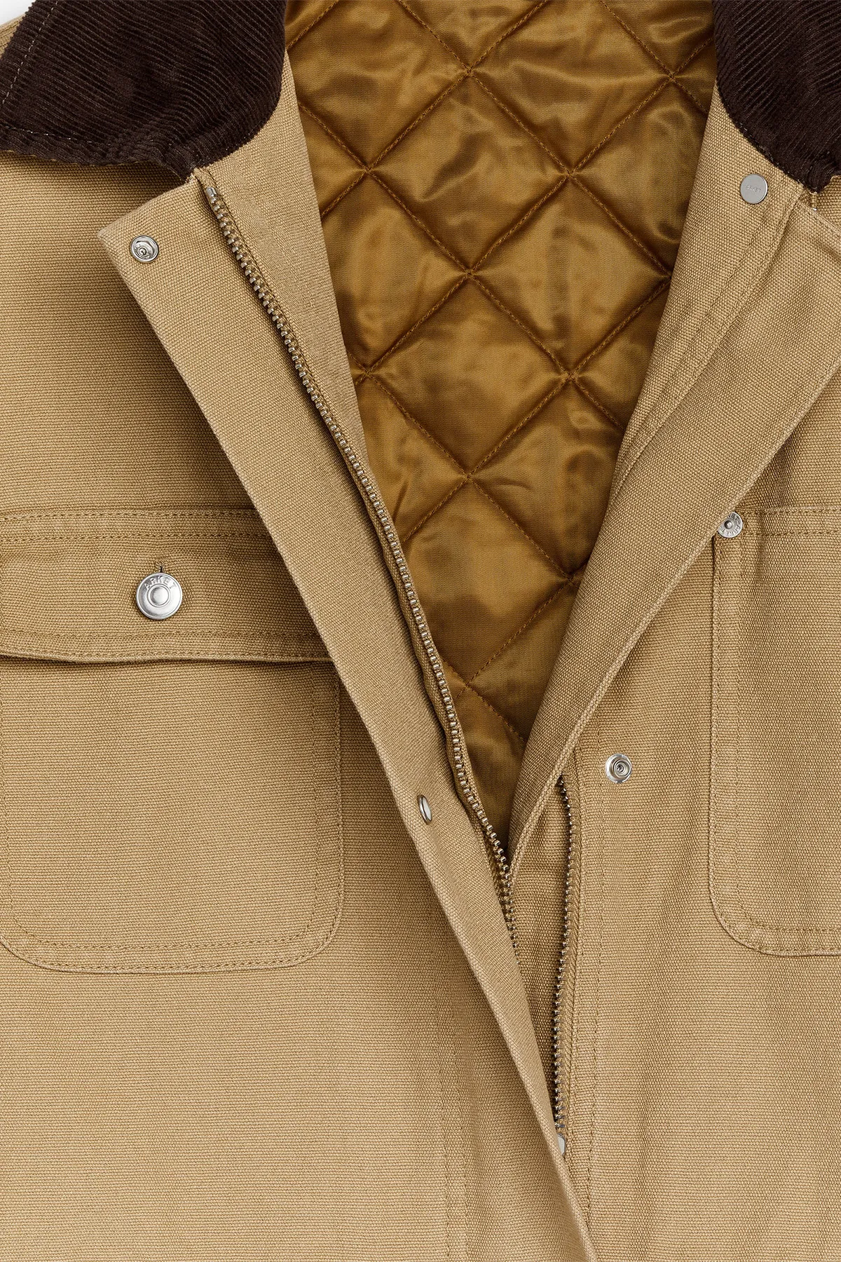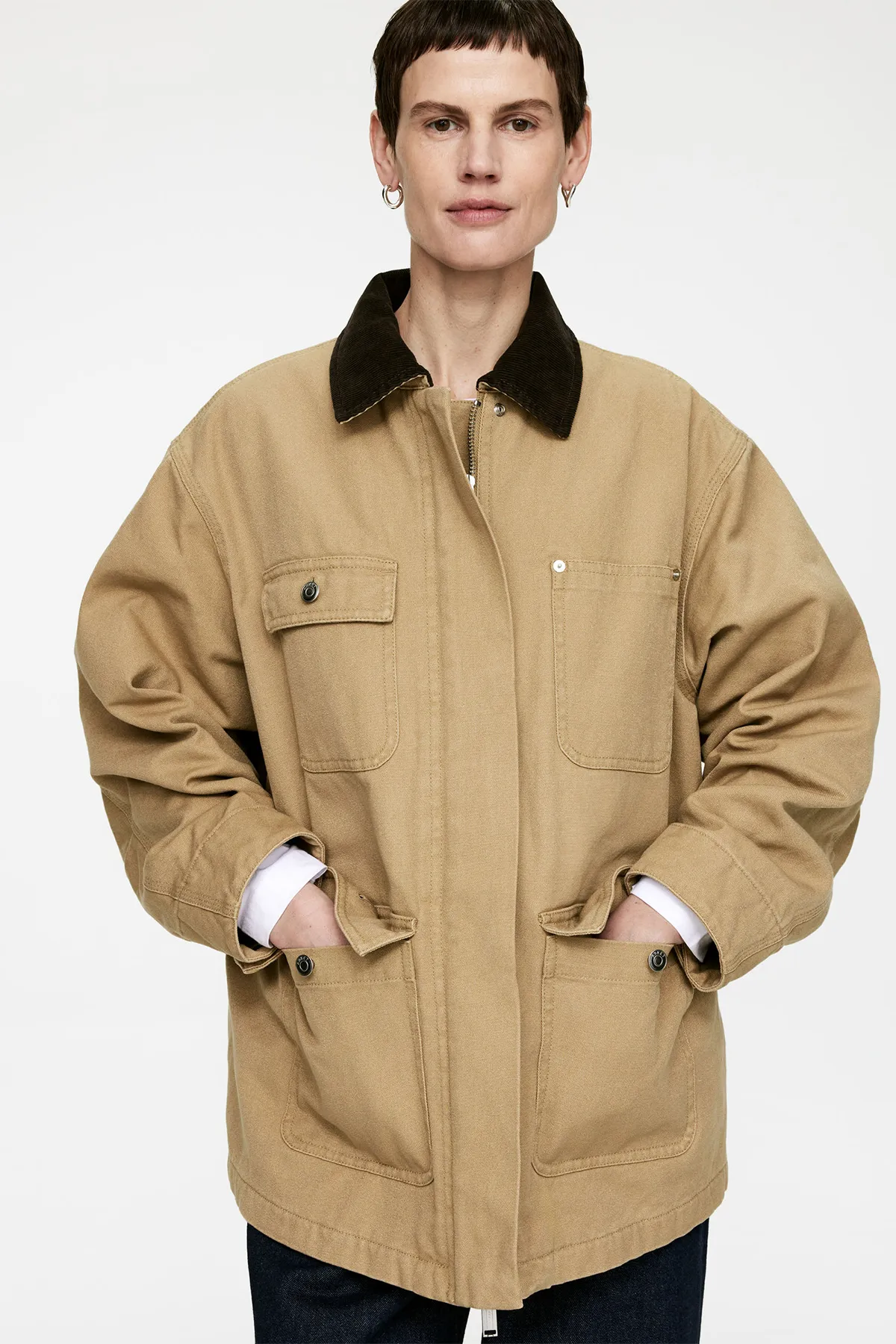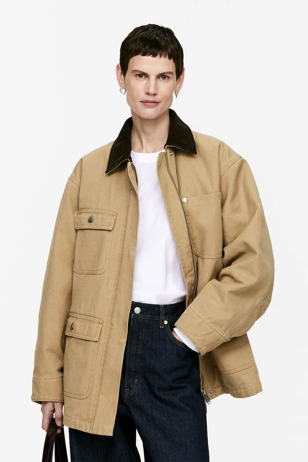 Куртка в стиле рабочей одежды из холщовой ткани. Модель на подкладке имеет вельветовый воротник, двухстороннюю металлическую молнию спереди и накладные карманы с пуговицами на ножке.