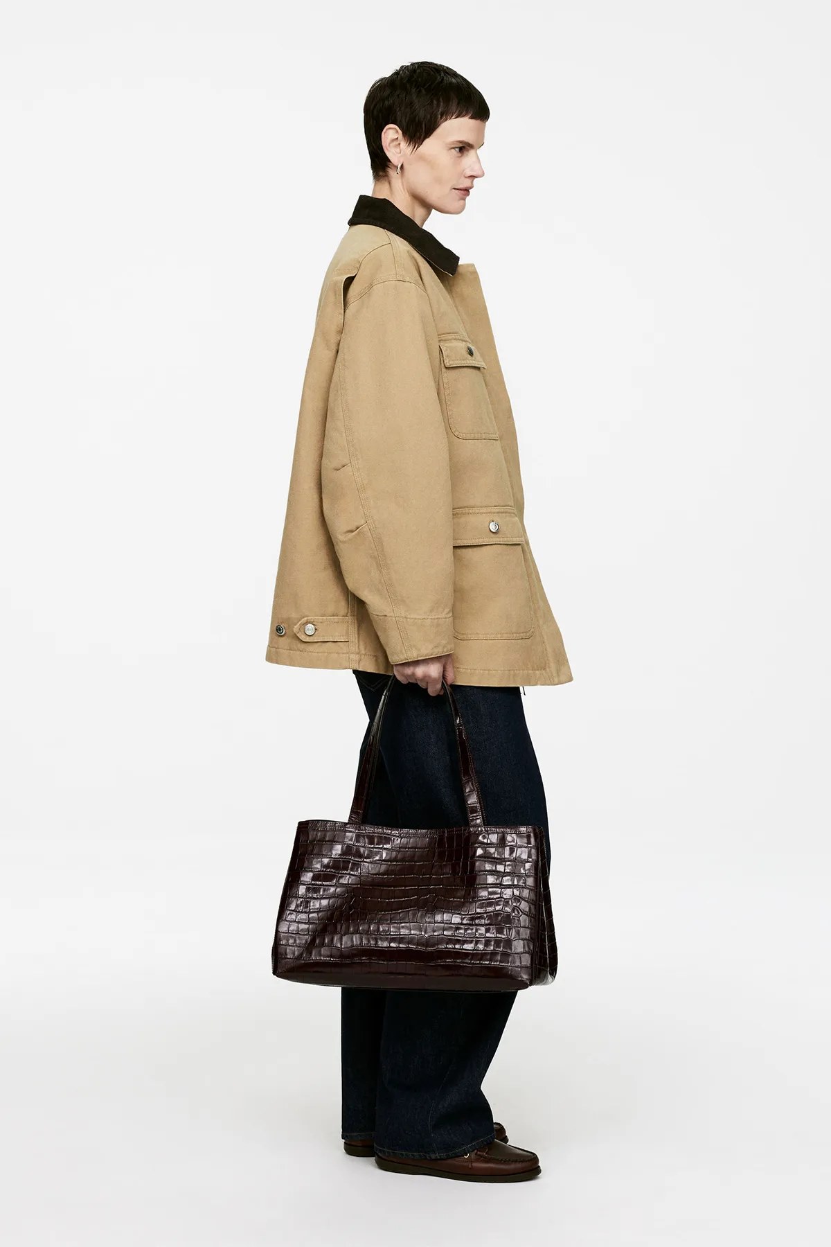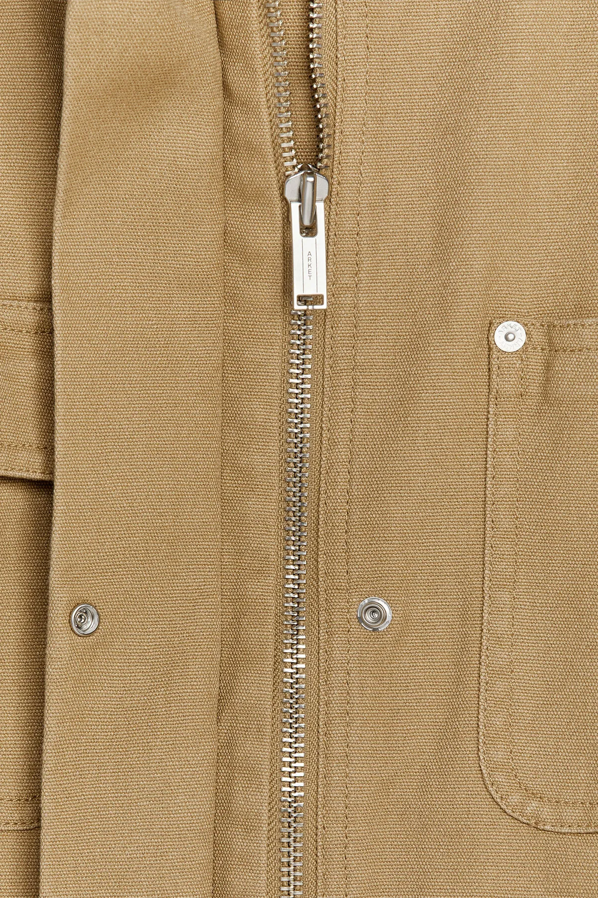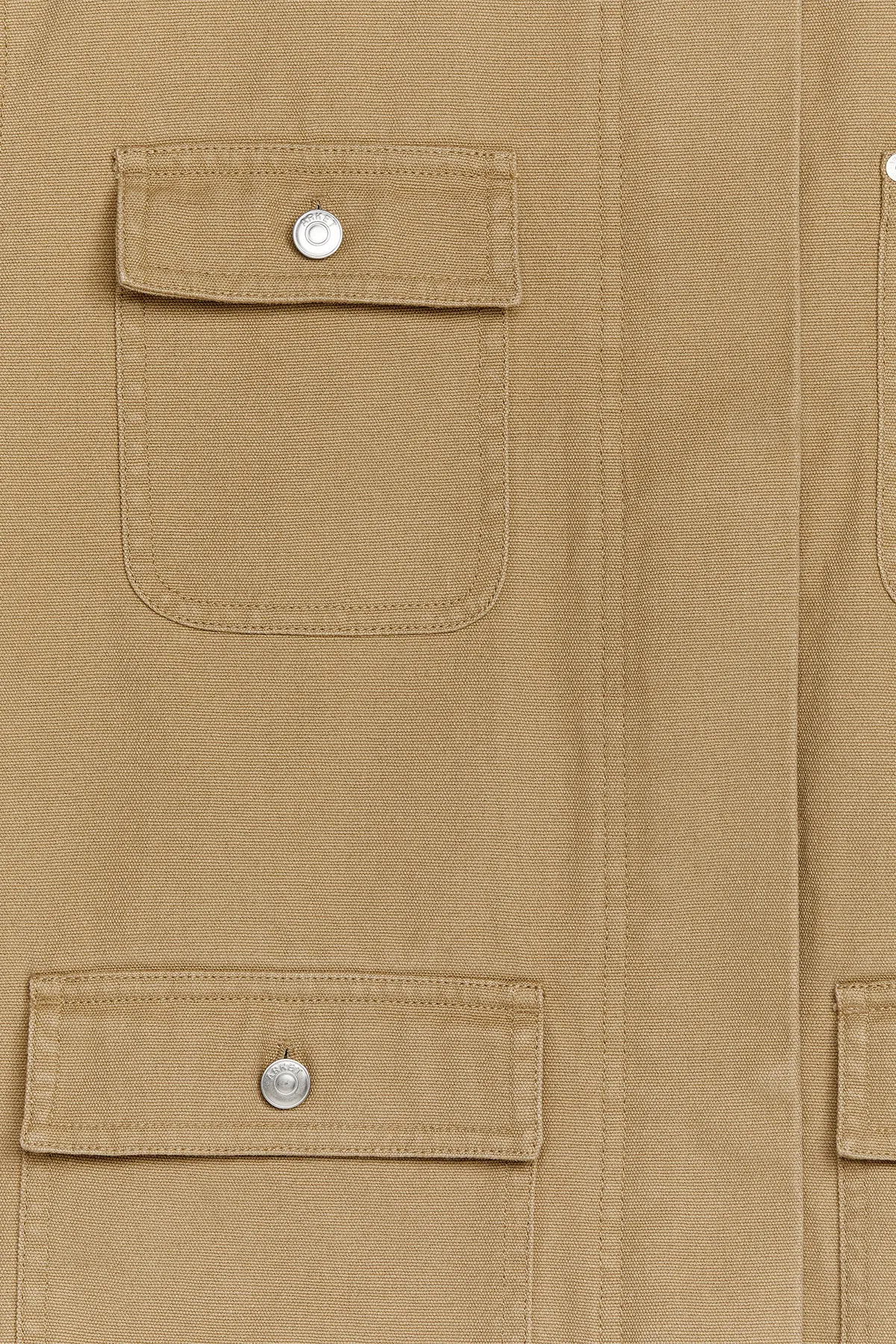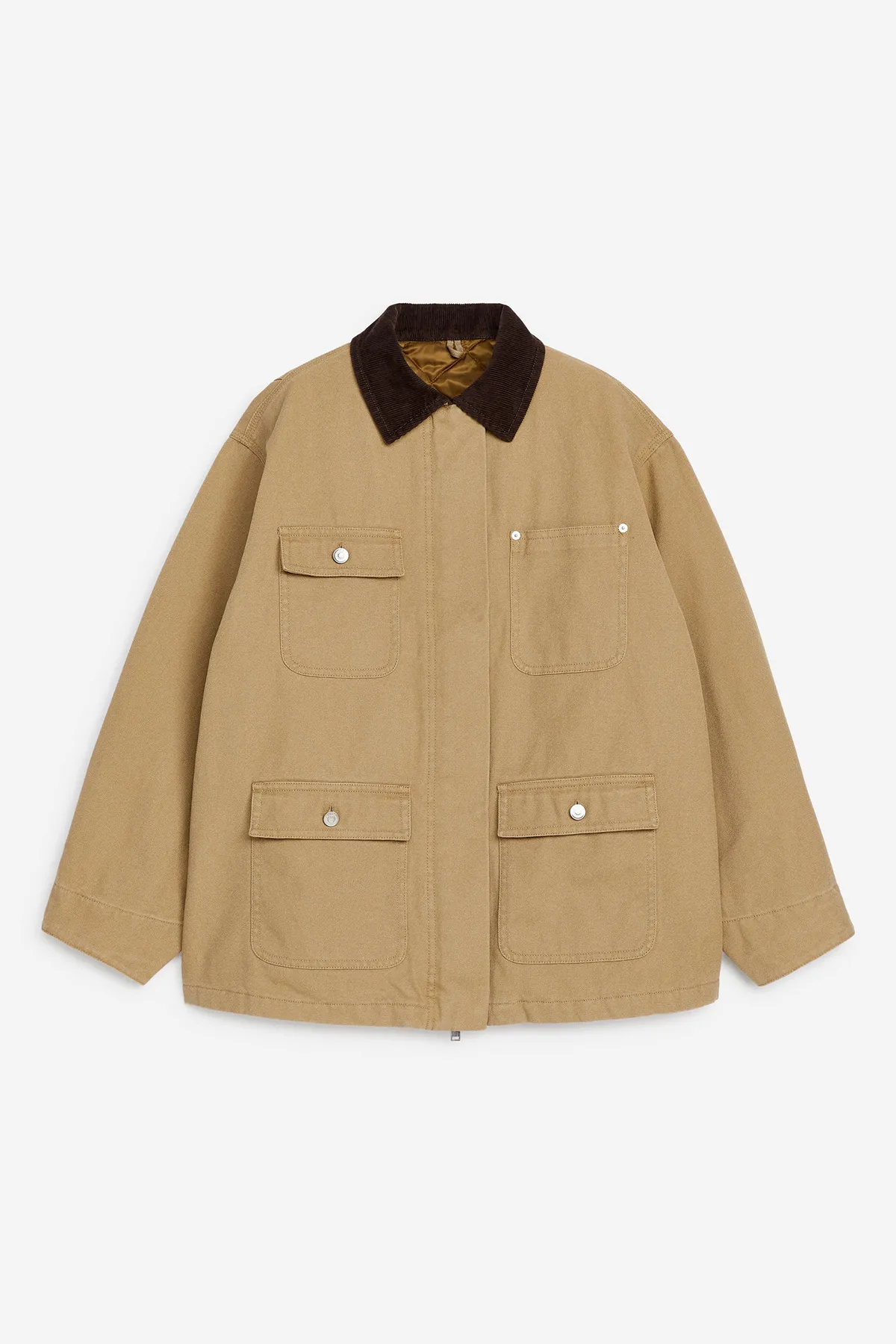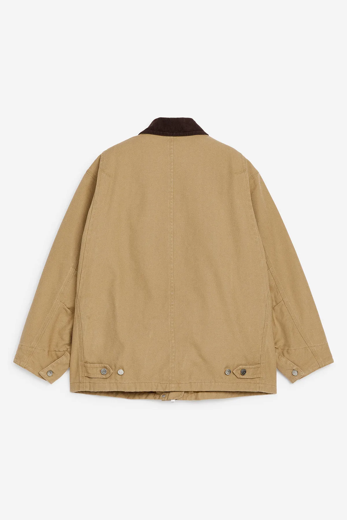 Куртка в стиле рабочей одежды из холщовой ткани. Модель на подкладке имеет вельветовый воротник, двухстороннюю металлическую молнию спереди и накладные карманы с пуговицами на ножке.
