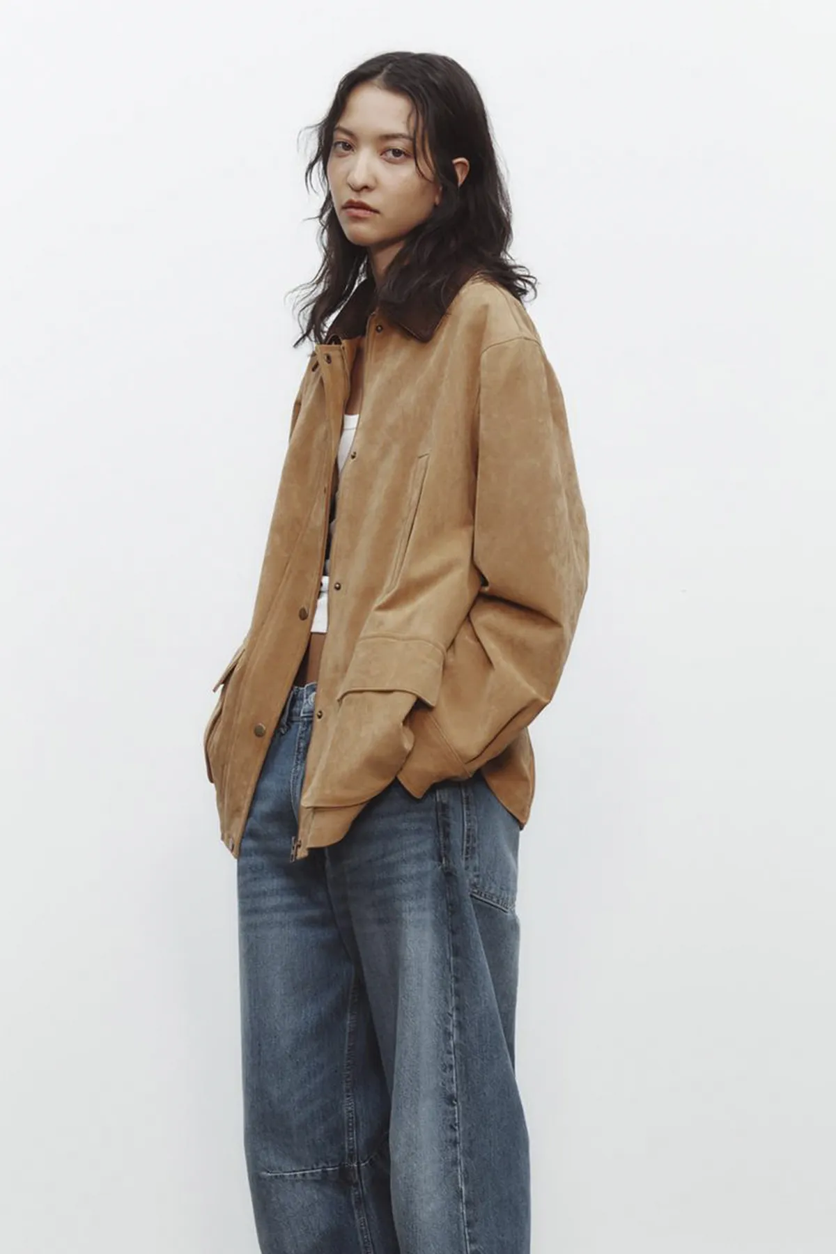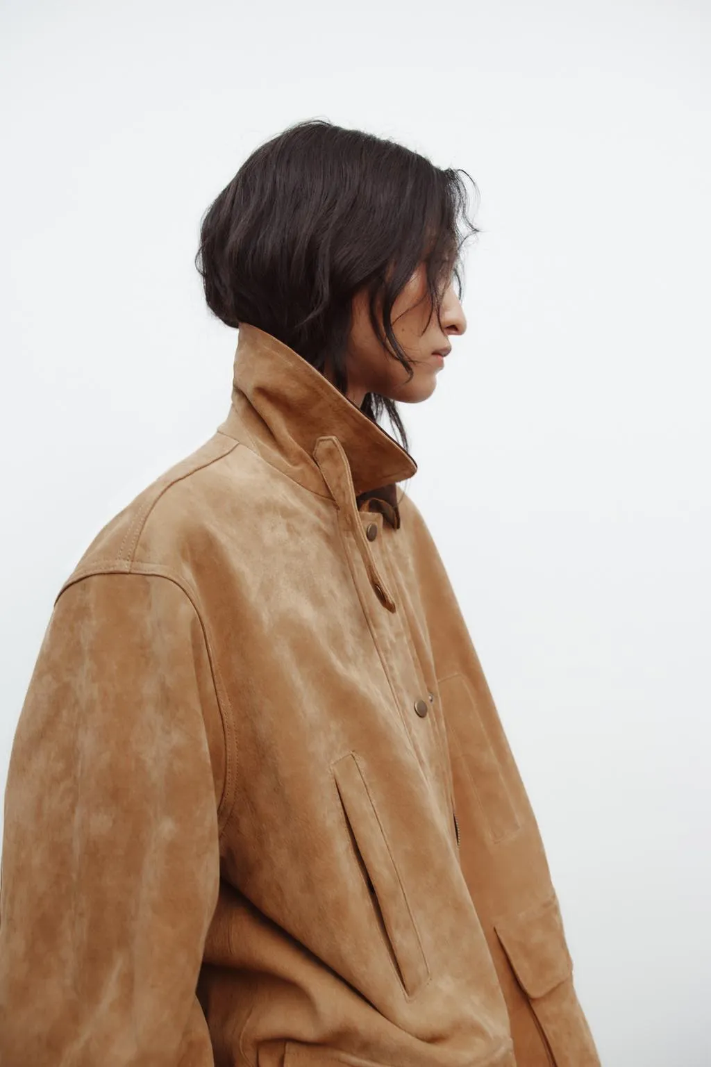 Куртка из 100% замши. Воротник с лацканами в тон с контрастной отделкой. Длинные рукава с манжетами на пуговицах. Передние карманы. Тональная отделка и складка сзади. Внутренняя подкладка. Застежка на молнию и кнопки спереди.