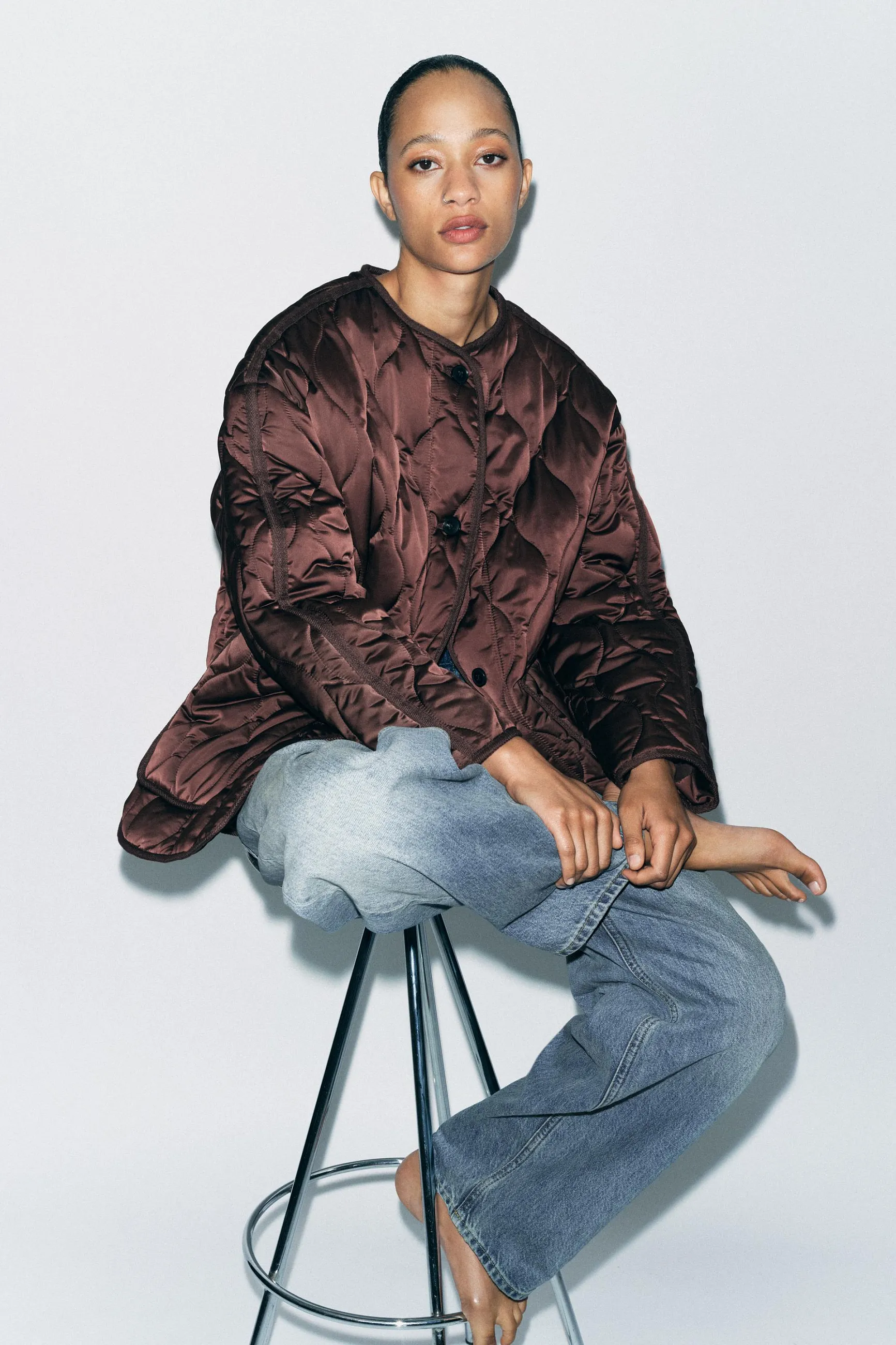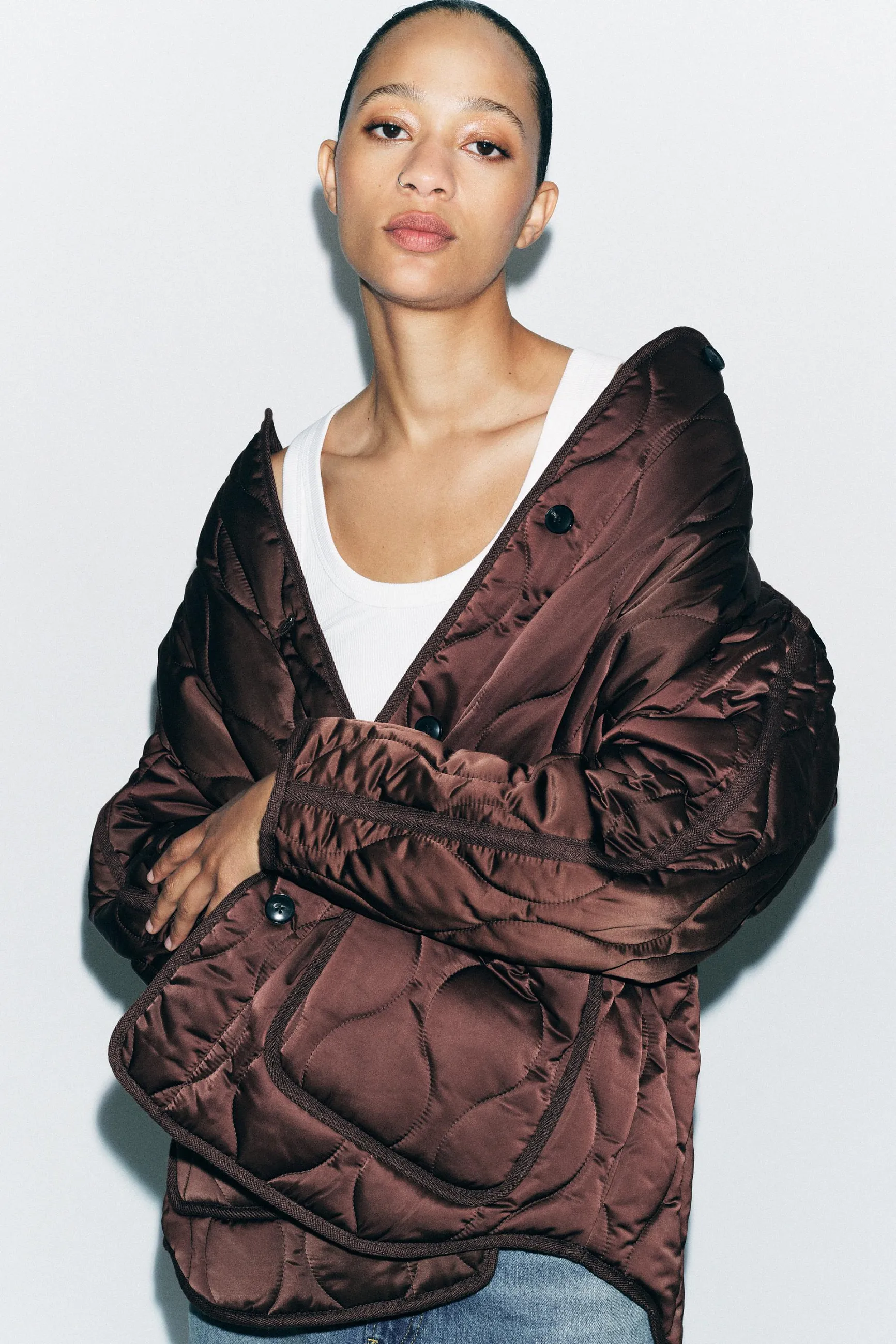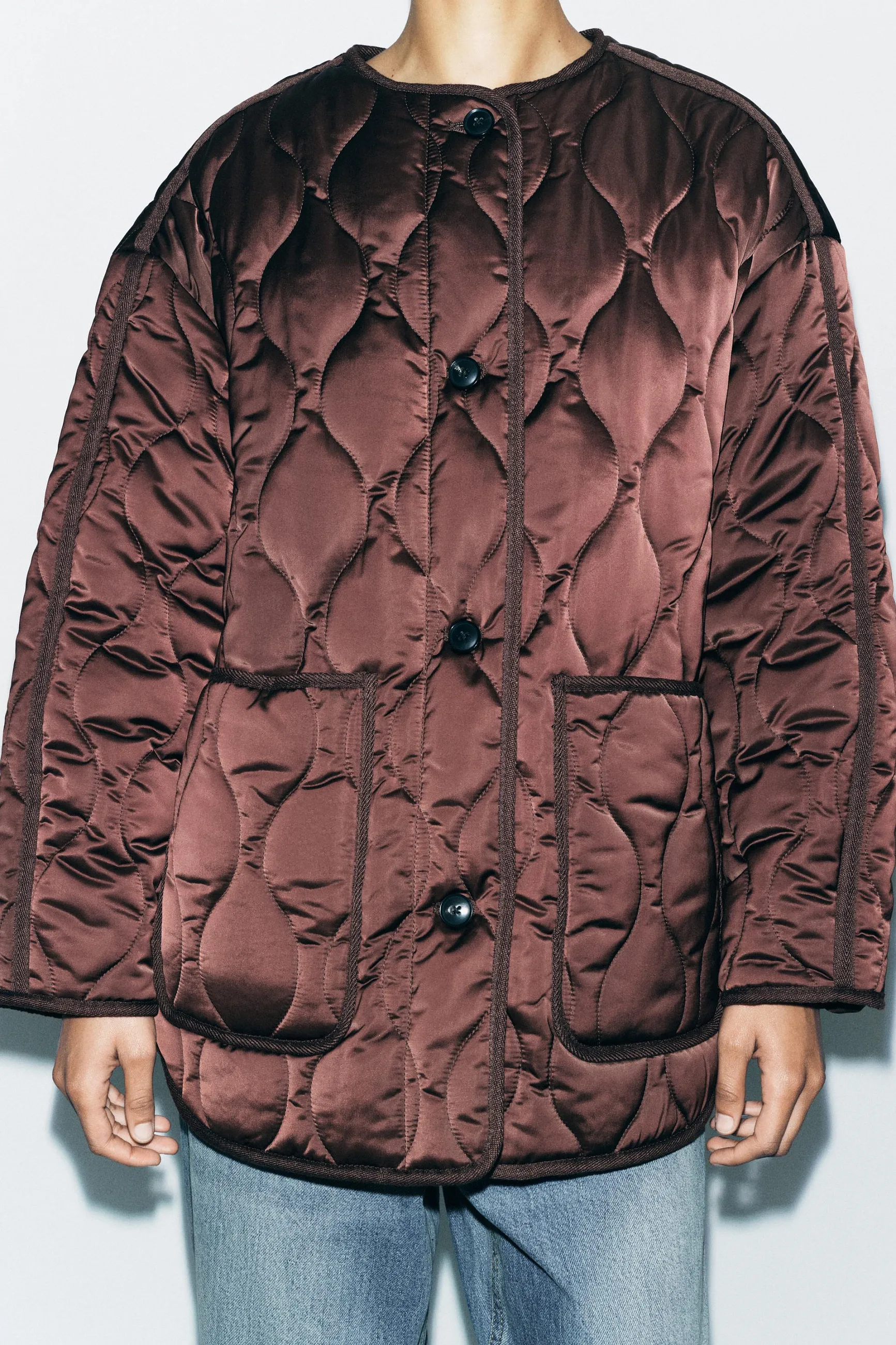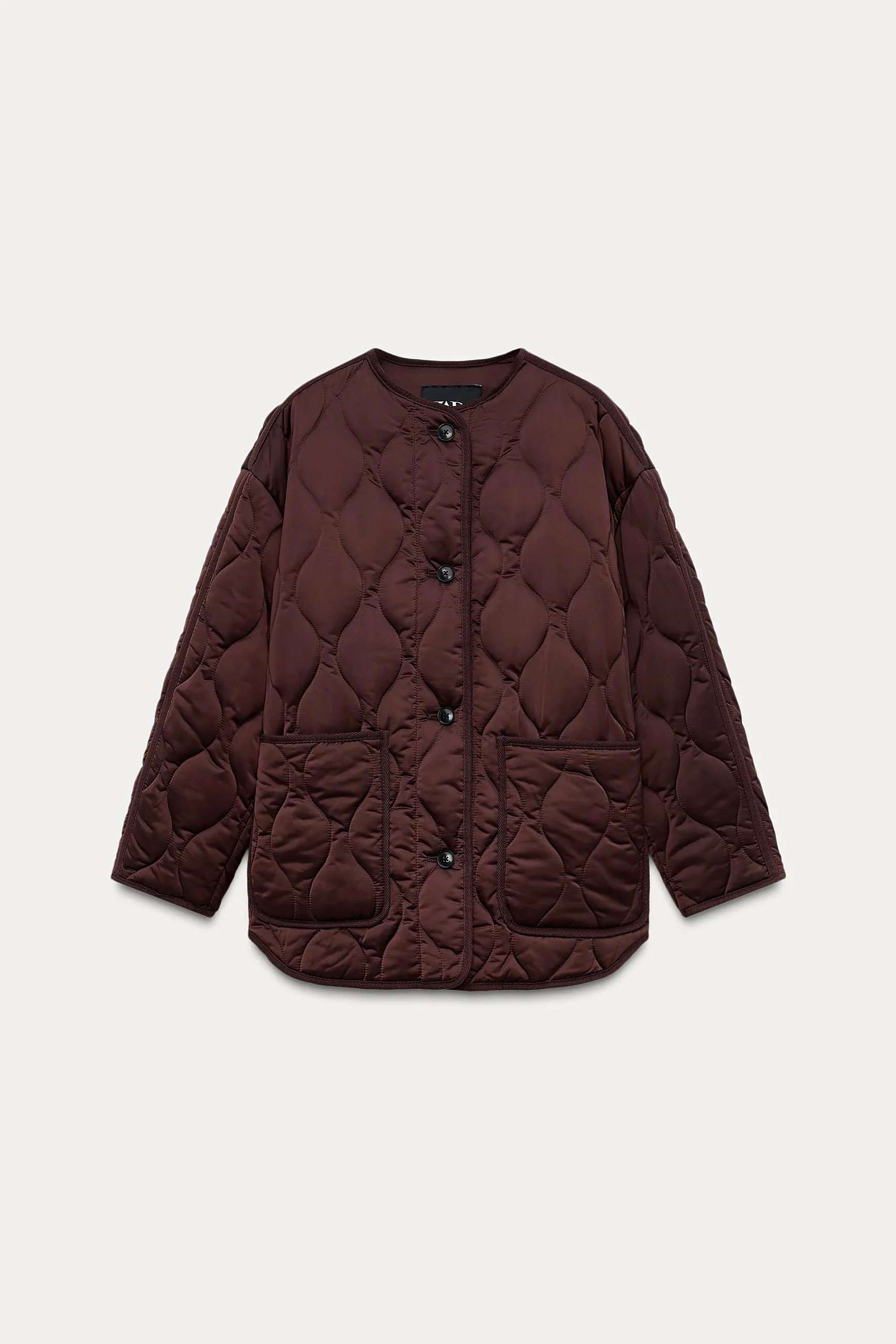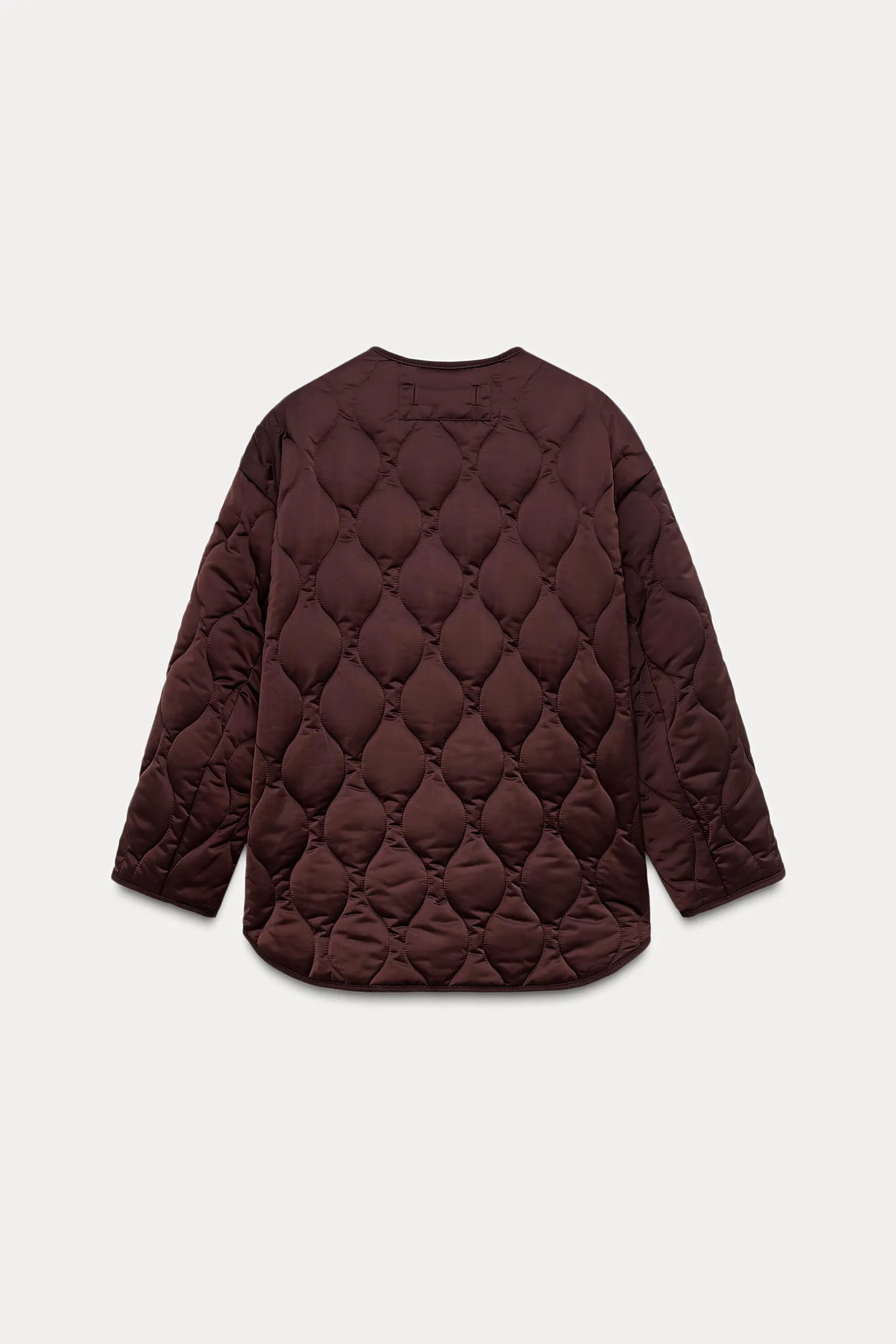 Утепленная стеганая куртка с круглым вырезом и длинными рукавами. Передние накладные карманы. Застегиваются на пуговицы.