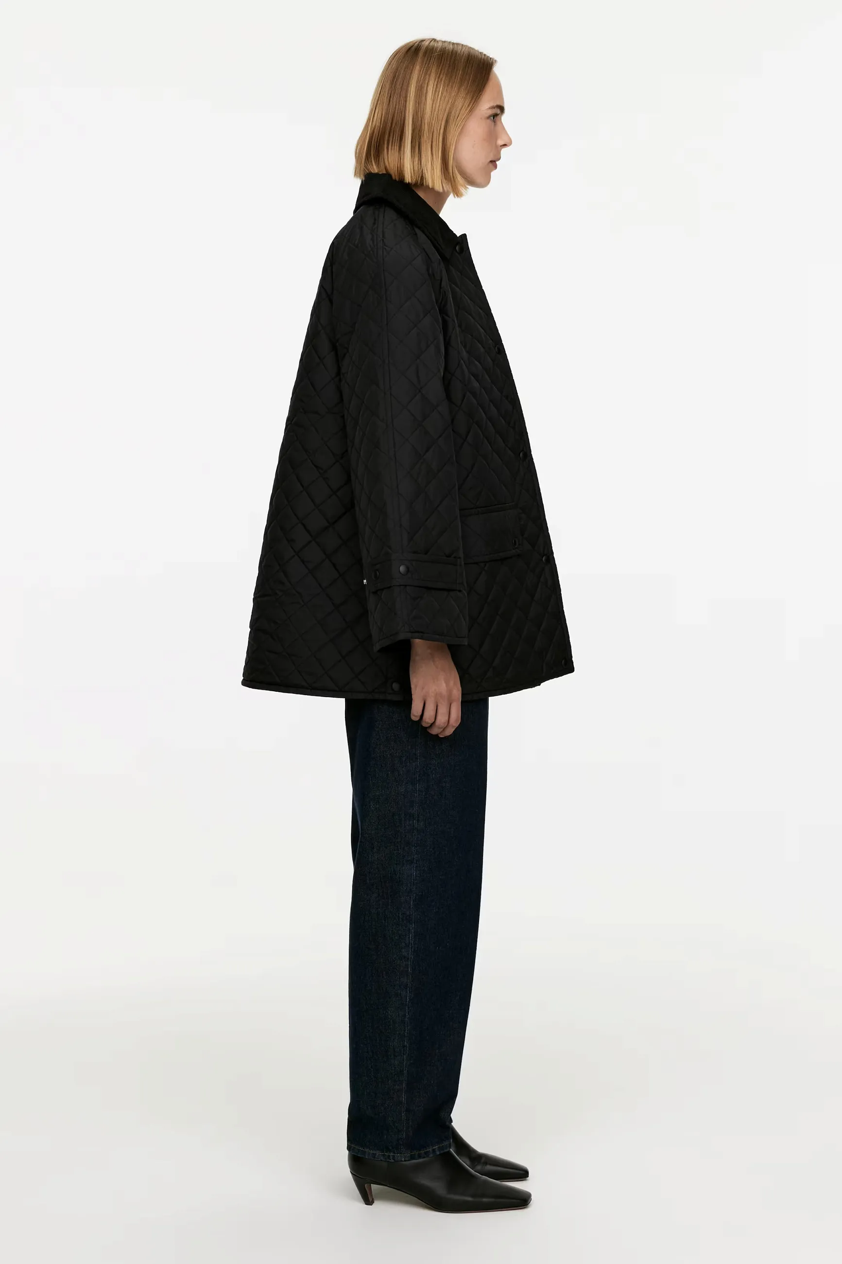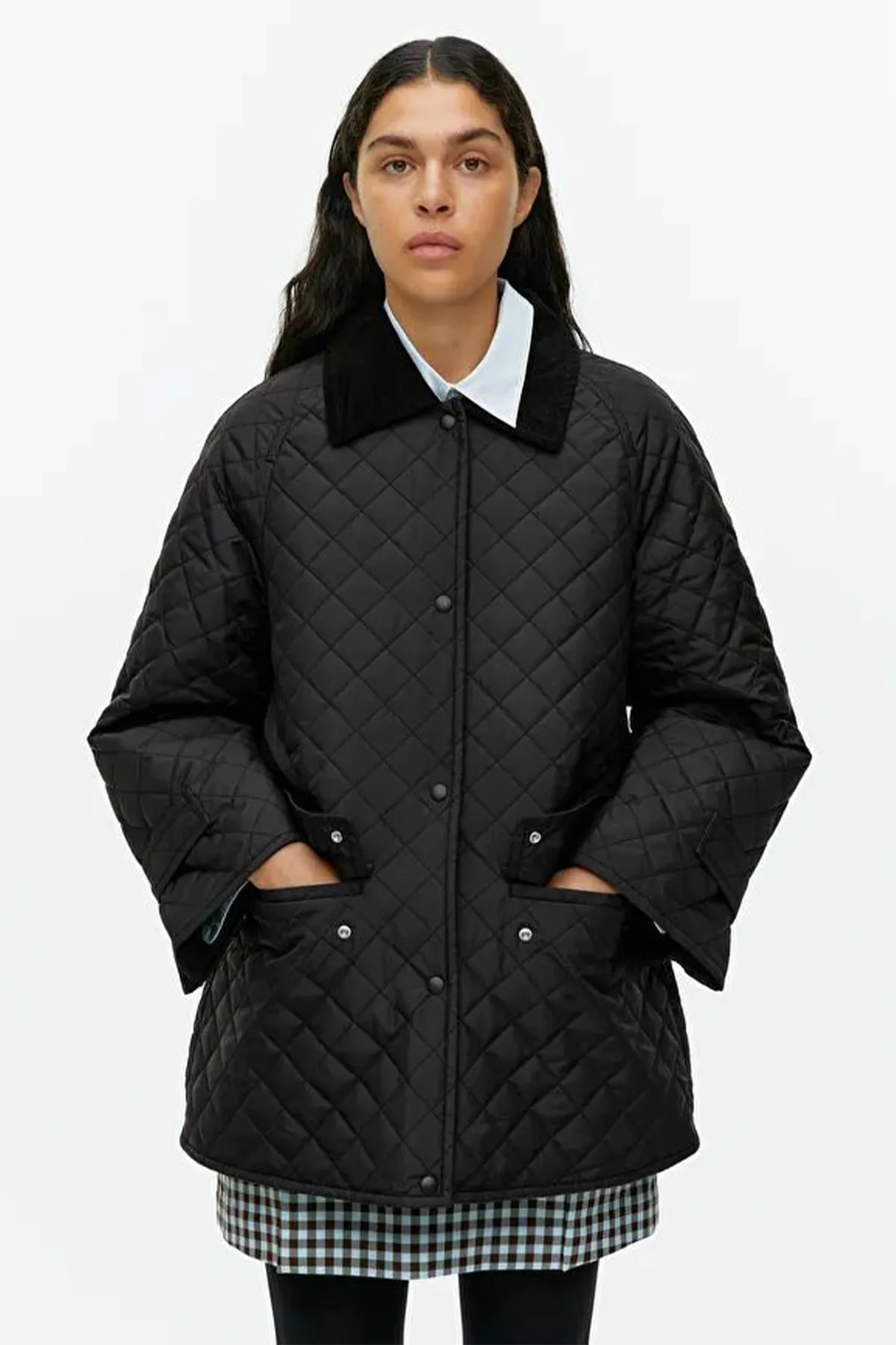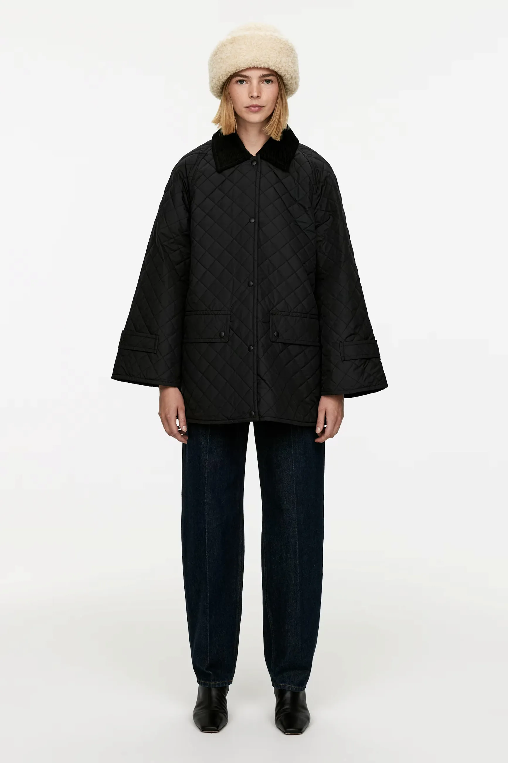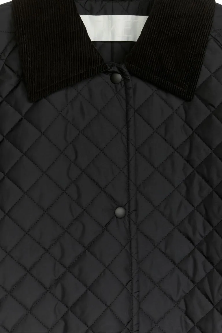 Утепленная куртка с ромбовидной стежкой и вельветовым воротником. Модель А-силуэта с рукавами реглан. Карманы с клапанами и кнопки спереди. Боковые разрезы застегиваются на кнопки.