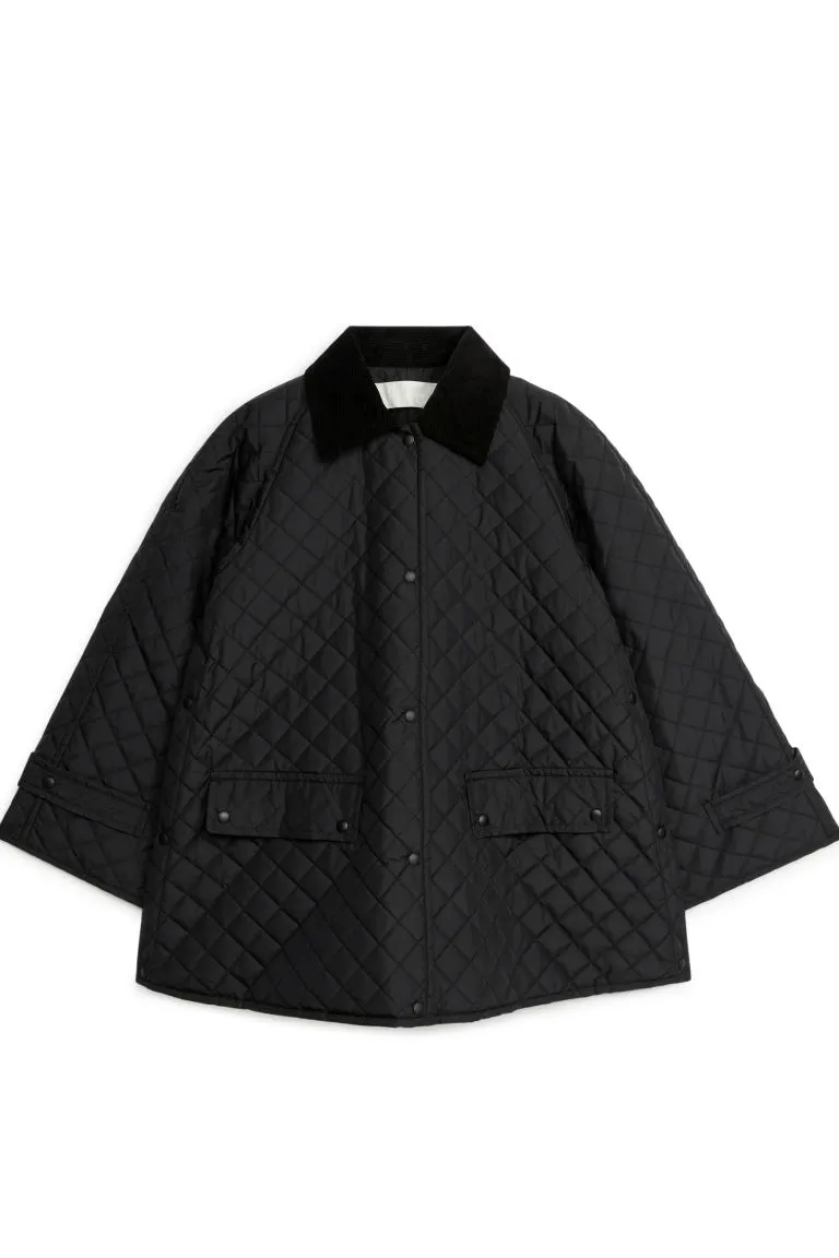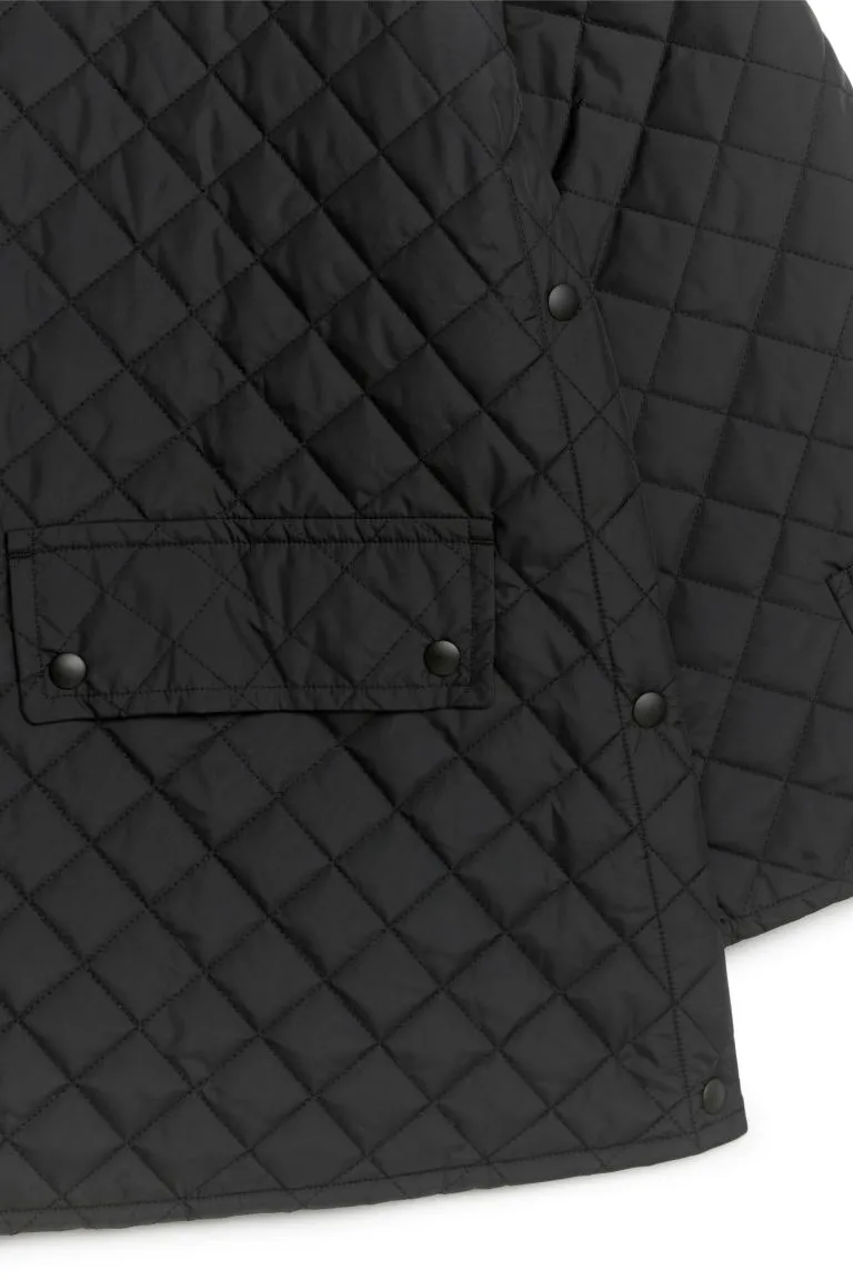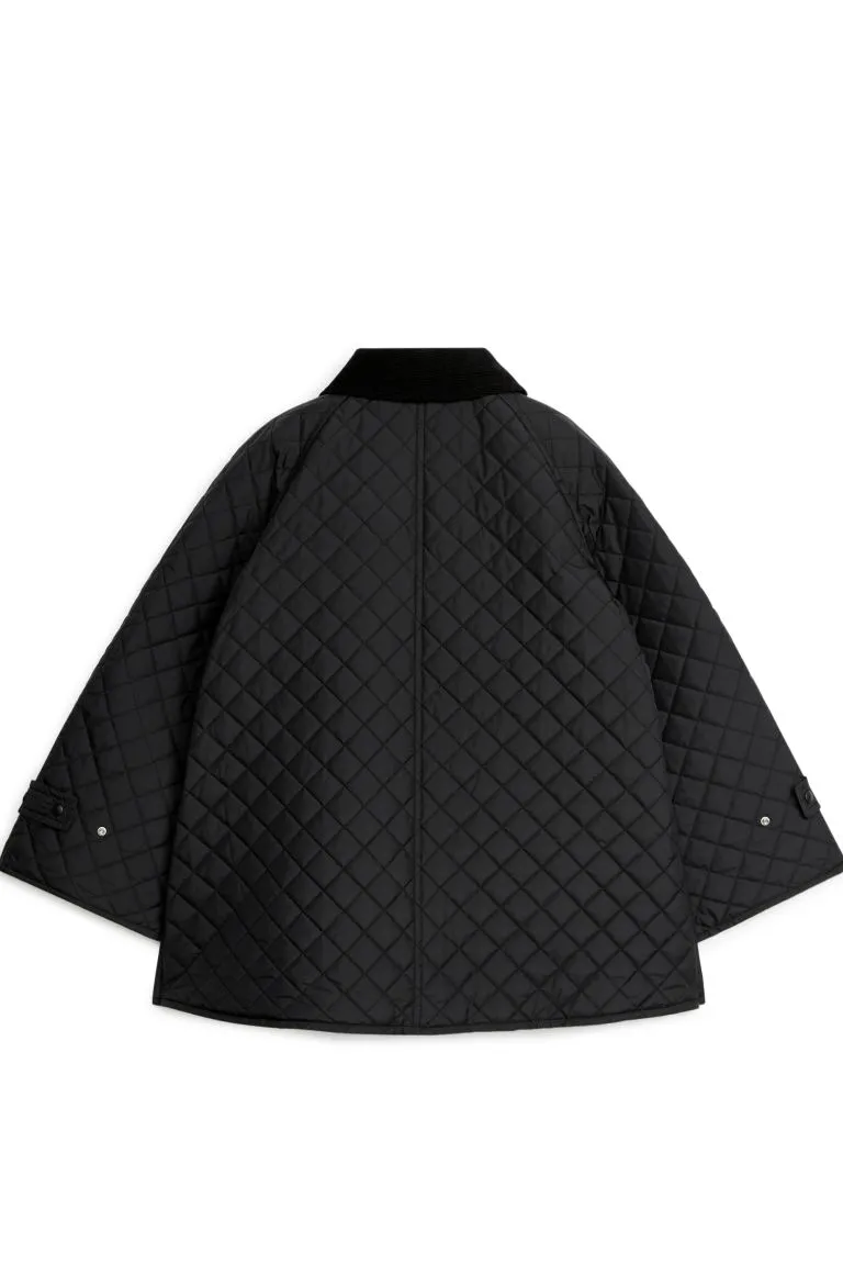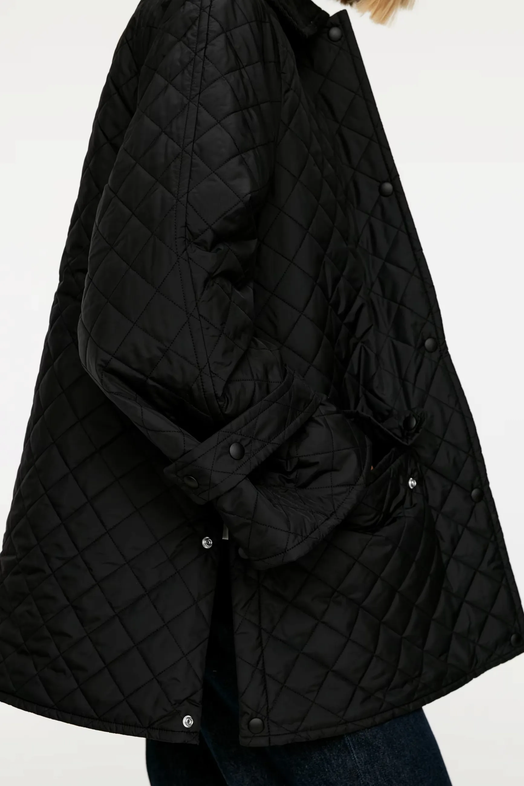 Утепленная куртка с ромбовидной стежкой и вельветовым воротником. Модель А-силуэта с рукавами реглан. Карманы с клапанами и кнопки спереди. Боковые разрезы застегиваются на кнопки.