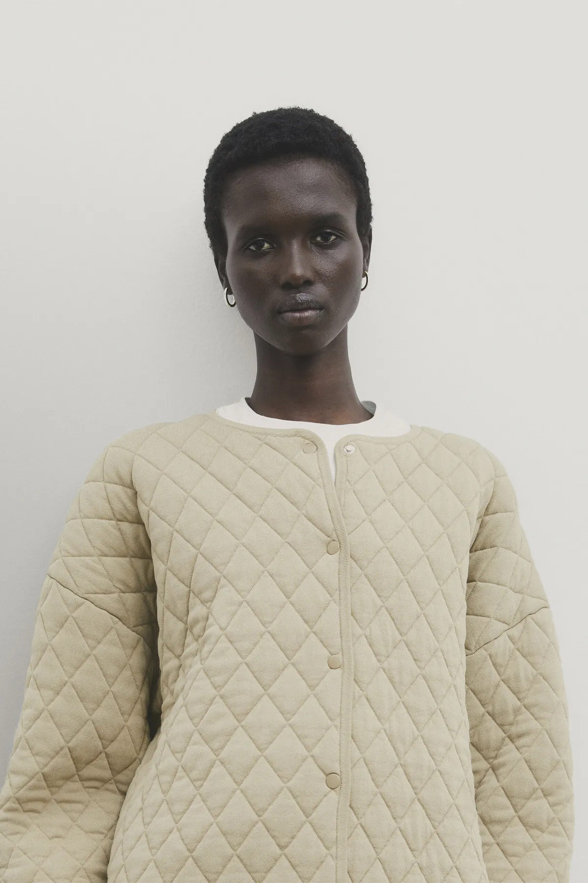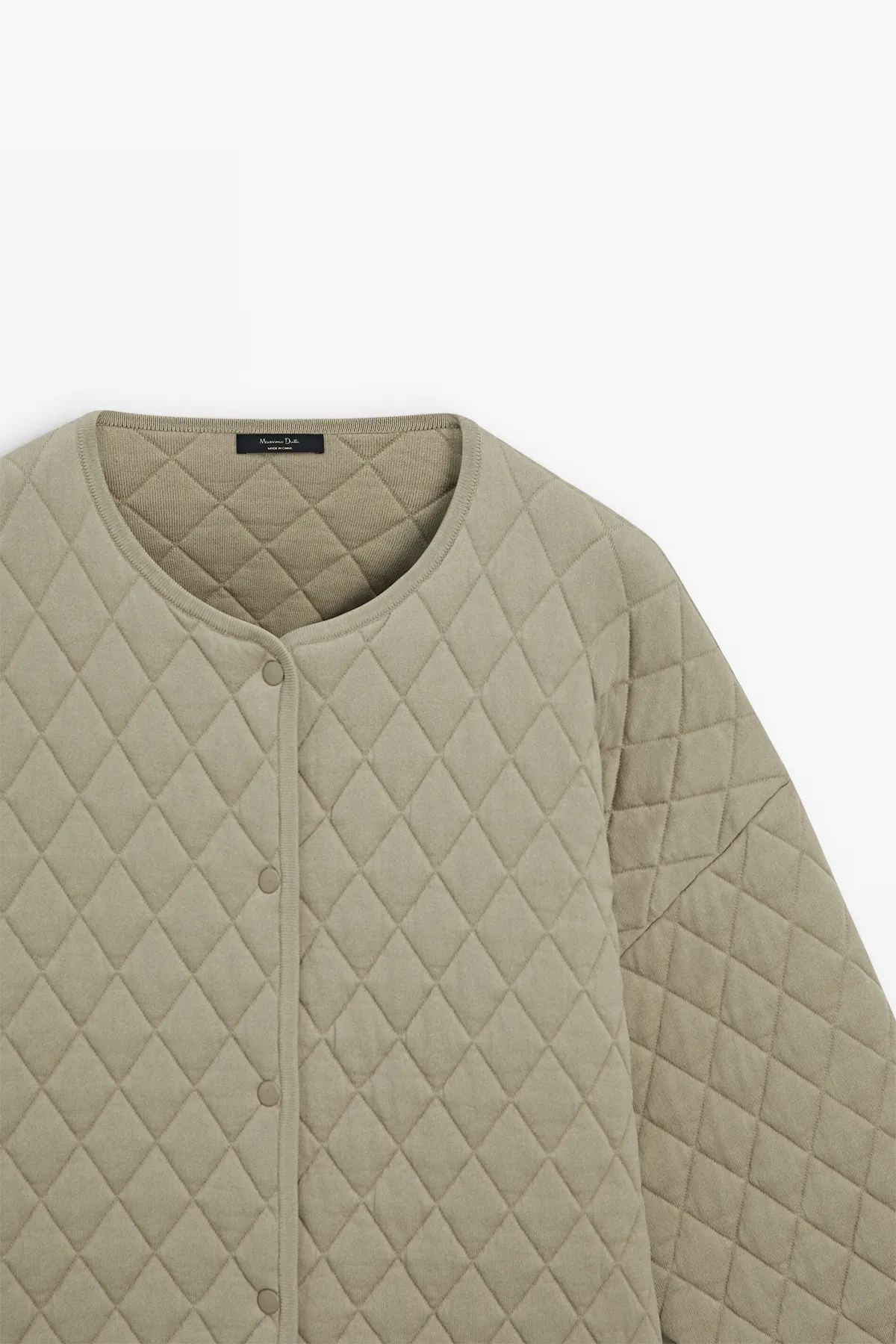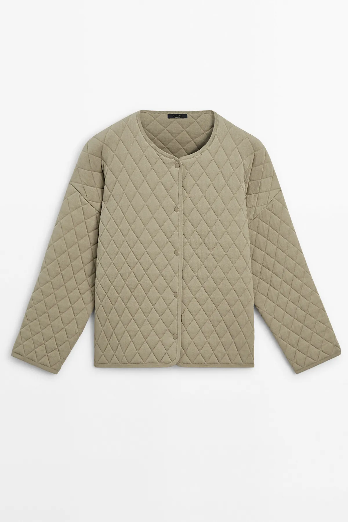 Стеганый бомбер с ромбовидной отделкой, со спущенным плечом. Застегивается на кнопки. И имеет круглый вырез.