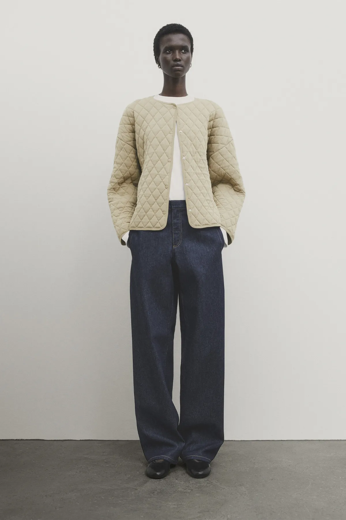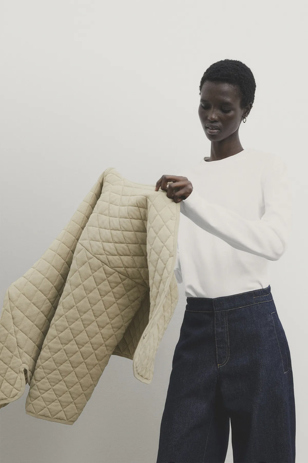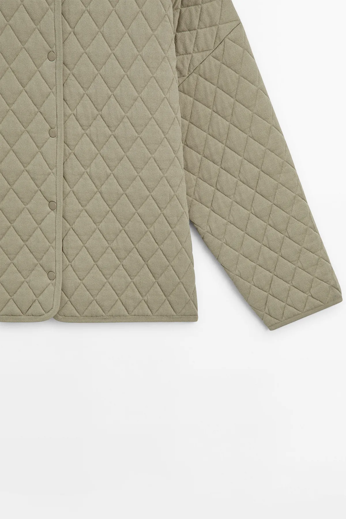 Стеганый бомбер с ромбовидной отделкой, со спущенным плечом. Застегивается на кнопки. И имеет круглый вырез.