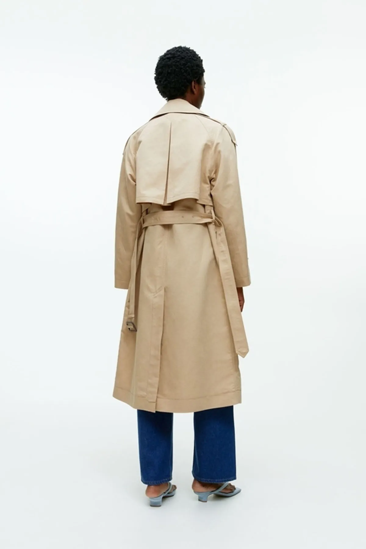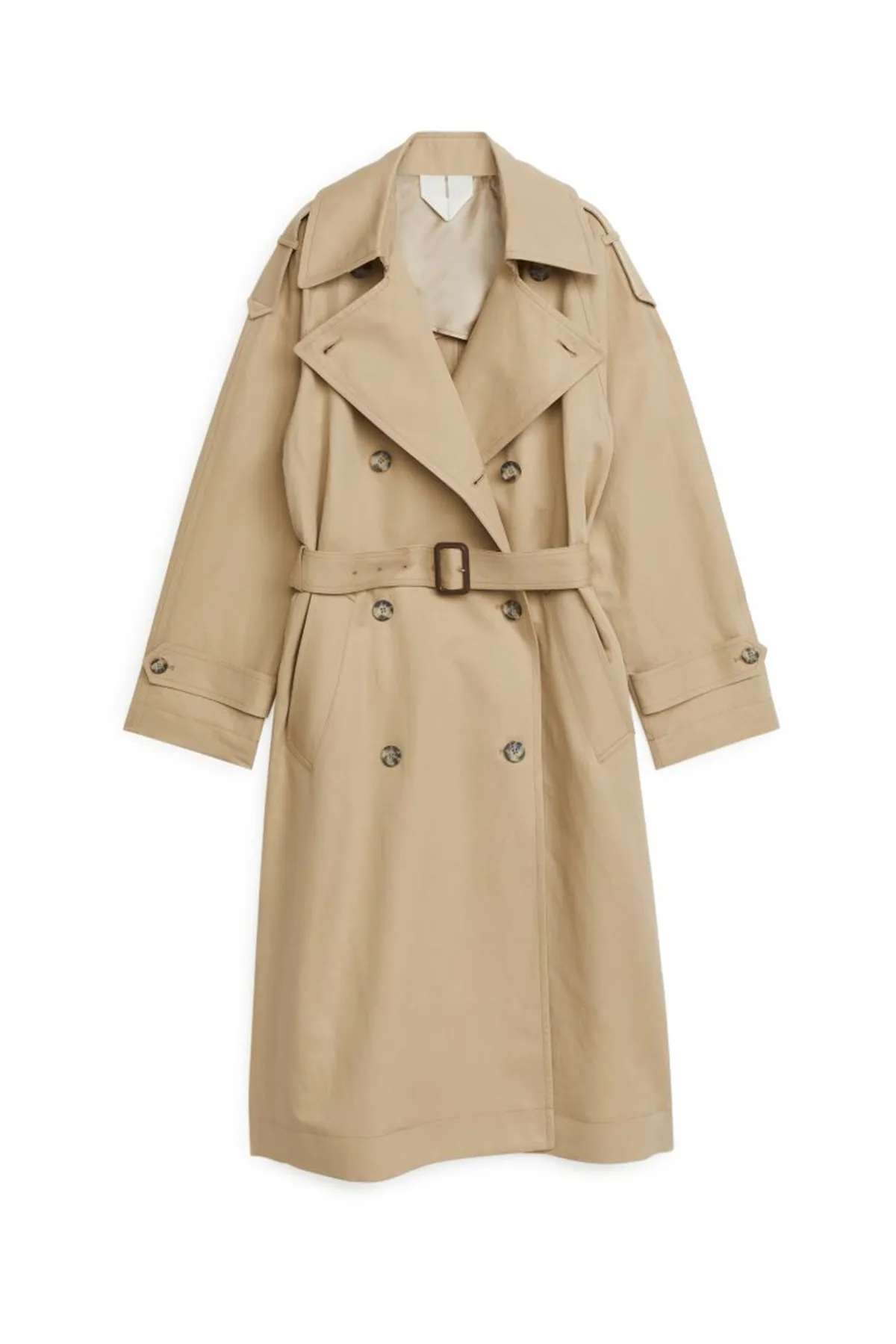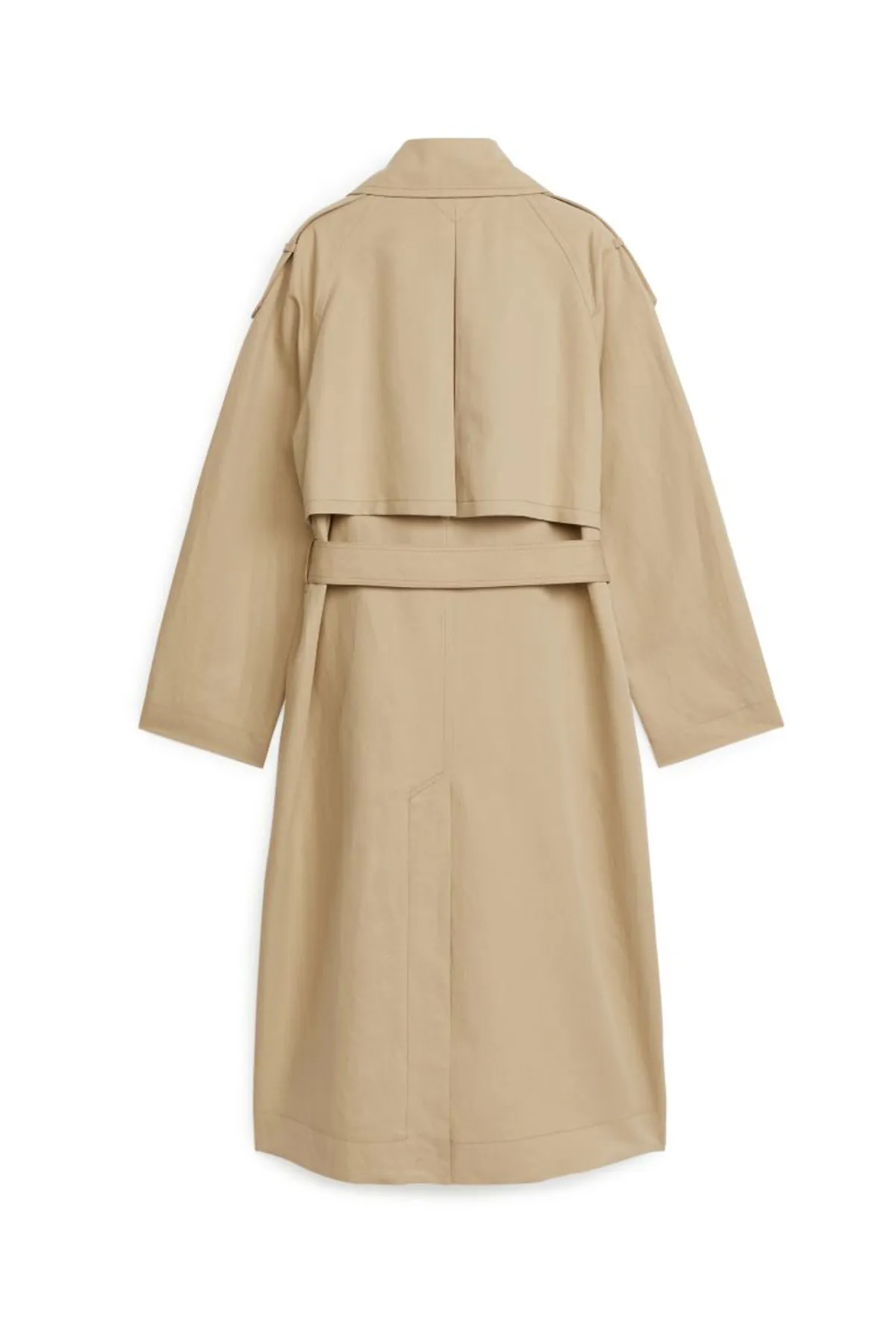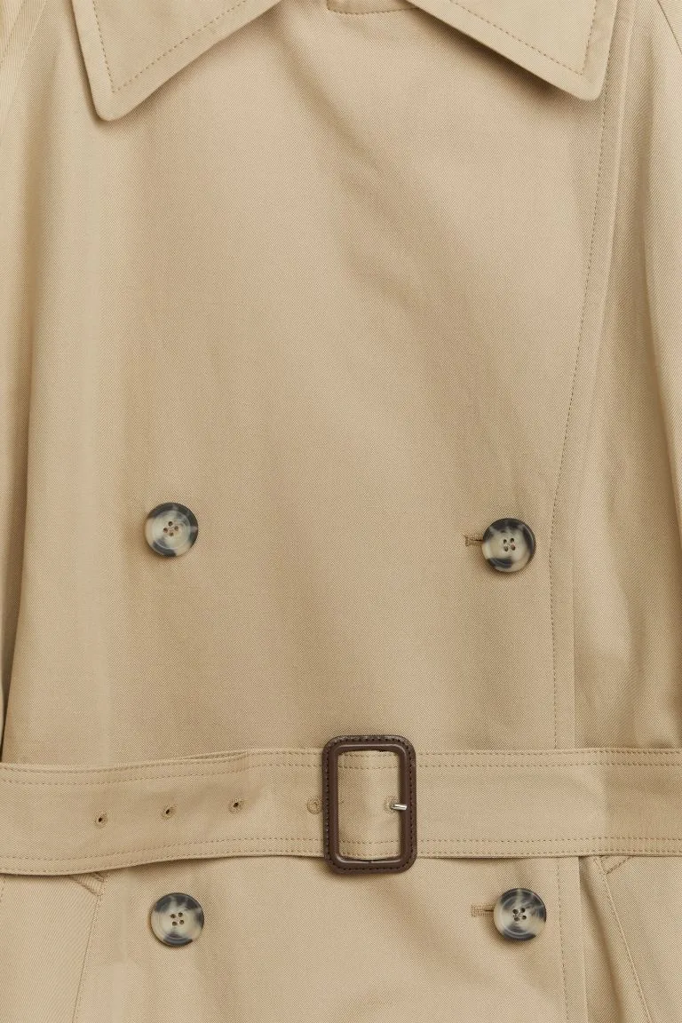 Двубортный тренч прямого кроя дополнен классическими деталями, такими как подплечники, регулируемый ремень и свободная кокетка на спине. Пальто изготовлено из смеси льна и хлопка.