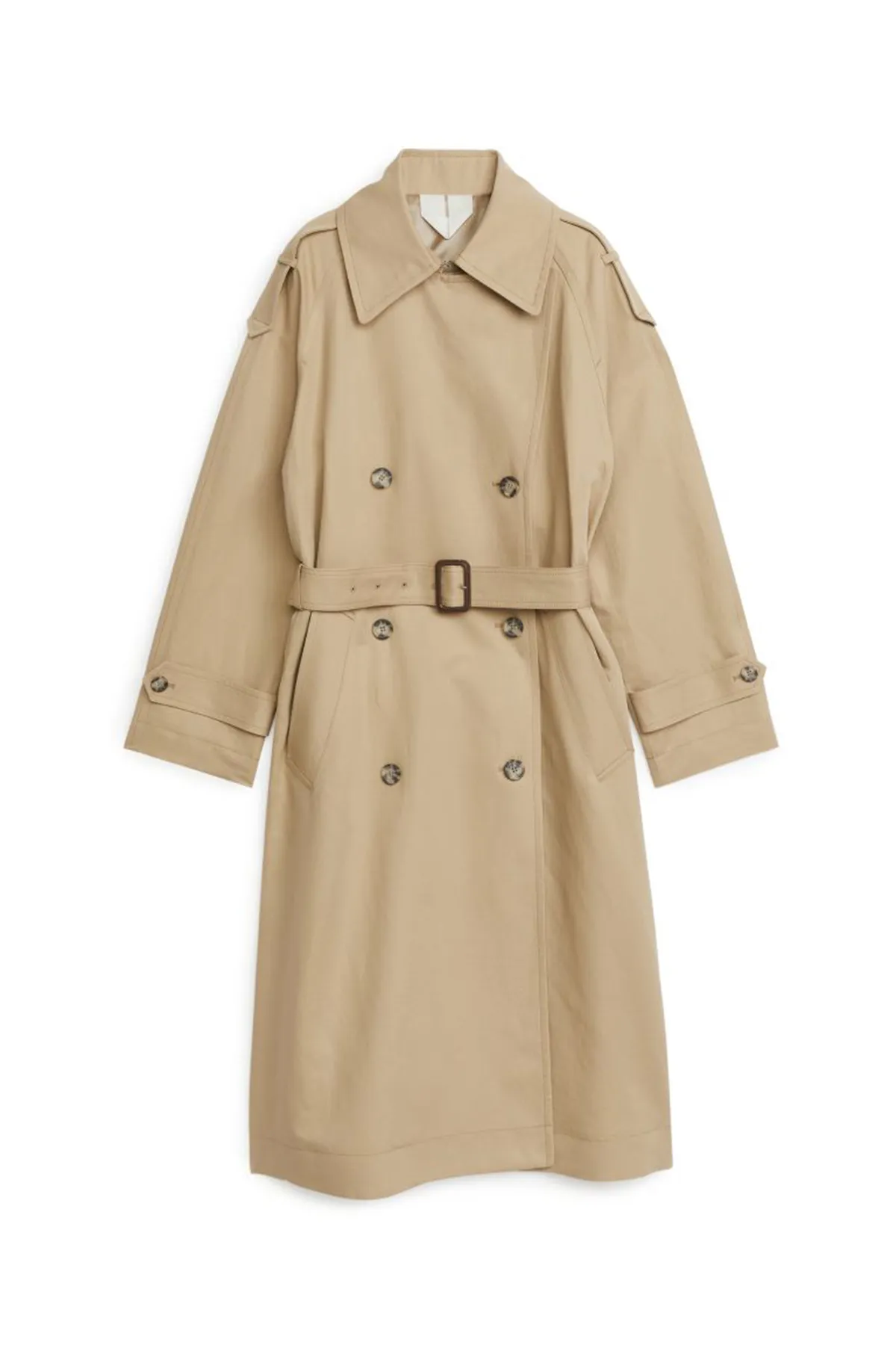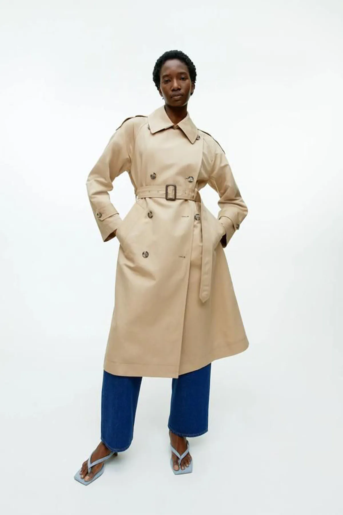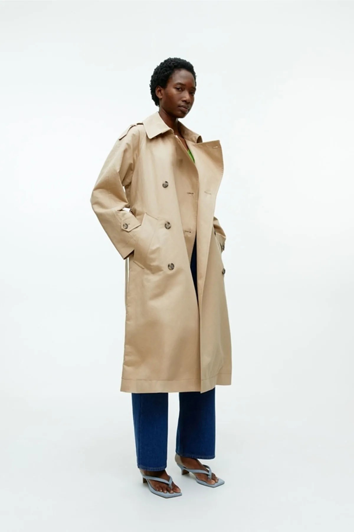 Двубортный тренч прямого кроя дополнен классическими деталями, такими как подплечники, регулируемый ремень и свободная кокетка на спине. Пальто изготовлено из смеси льна и хлопка.