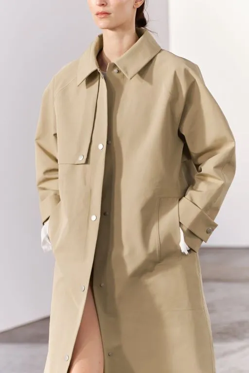 Тренч с воротником с лацканами и длинными рукавами с кнопками на манжетах. Боковые прорезные карманы, термопроклеенные внутренние швы и застежка на кнопки спереди. Тренч прямого кроя, который подчеркивает черты классического тренча и превращает его в минималистичный предмет одежды с утонченными линиями. Такие детали, как воротник рубашки, незаметная застежка спереди и боковые прорезные карманы, придают этому изделию современный и непринужденный вид.